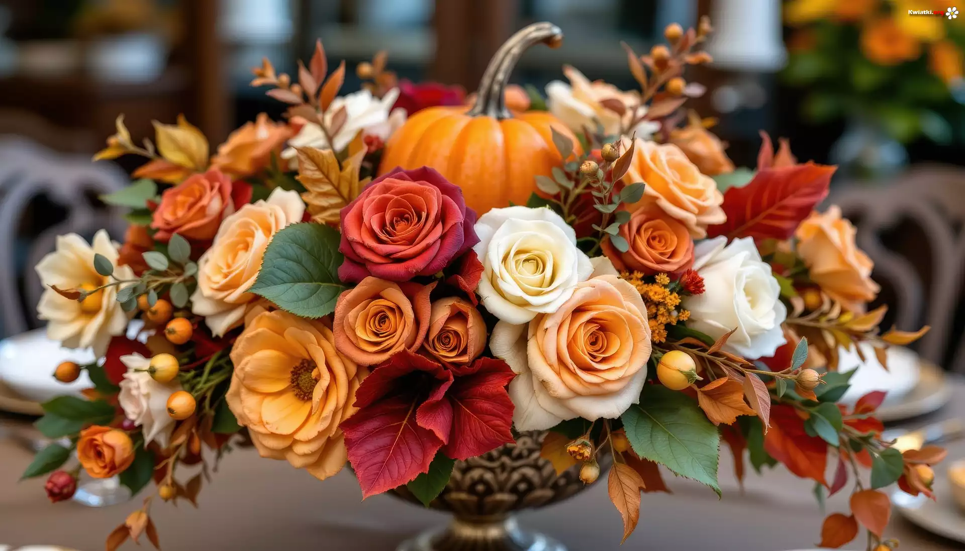 Kwiaty, Róże, Dynia, Jesienny, Bukiet, Grafika AI - Zdjęcia