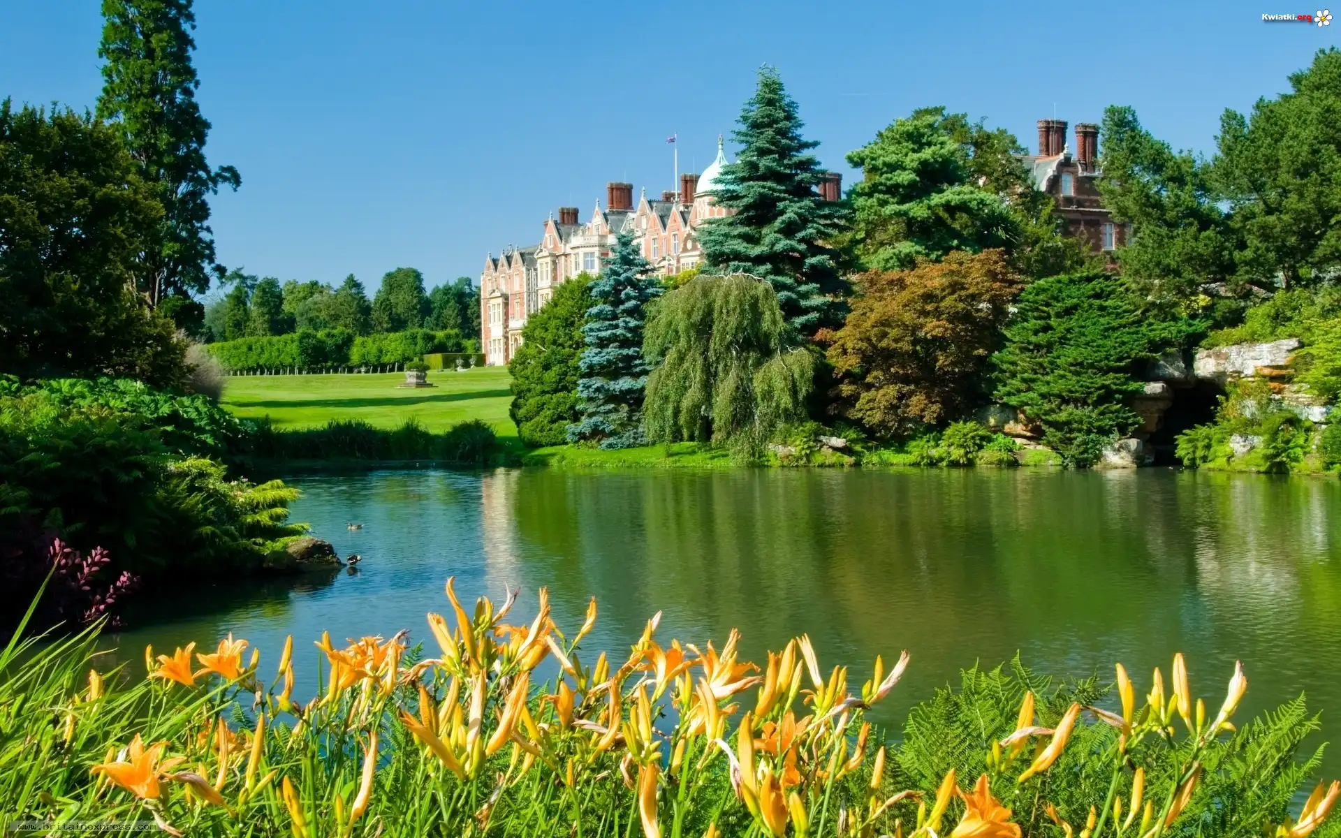 Jeziorko, Kwiatki, Drzewa, Pałac, Sandringham, Anglia - Zdjęcia