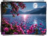 Jezioro, Góry, Noc, Księżyc, Rośliny, Czerwone, Kwiaty, Kwitnące, Drzewo - Zdjęcia