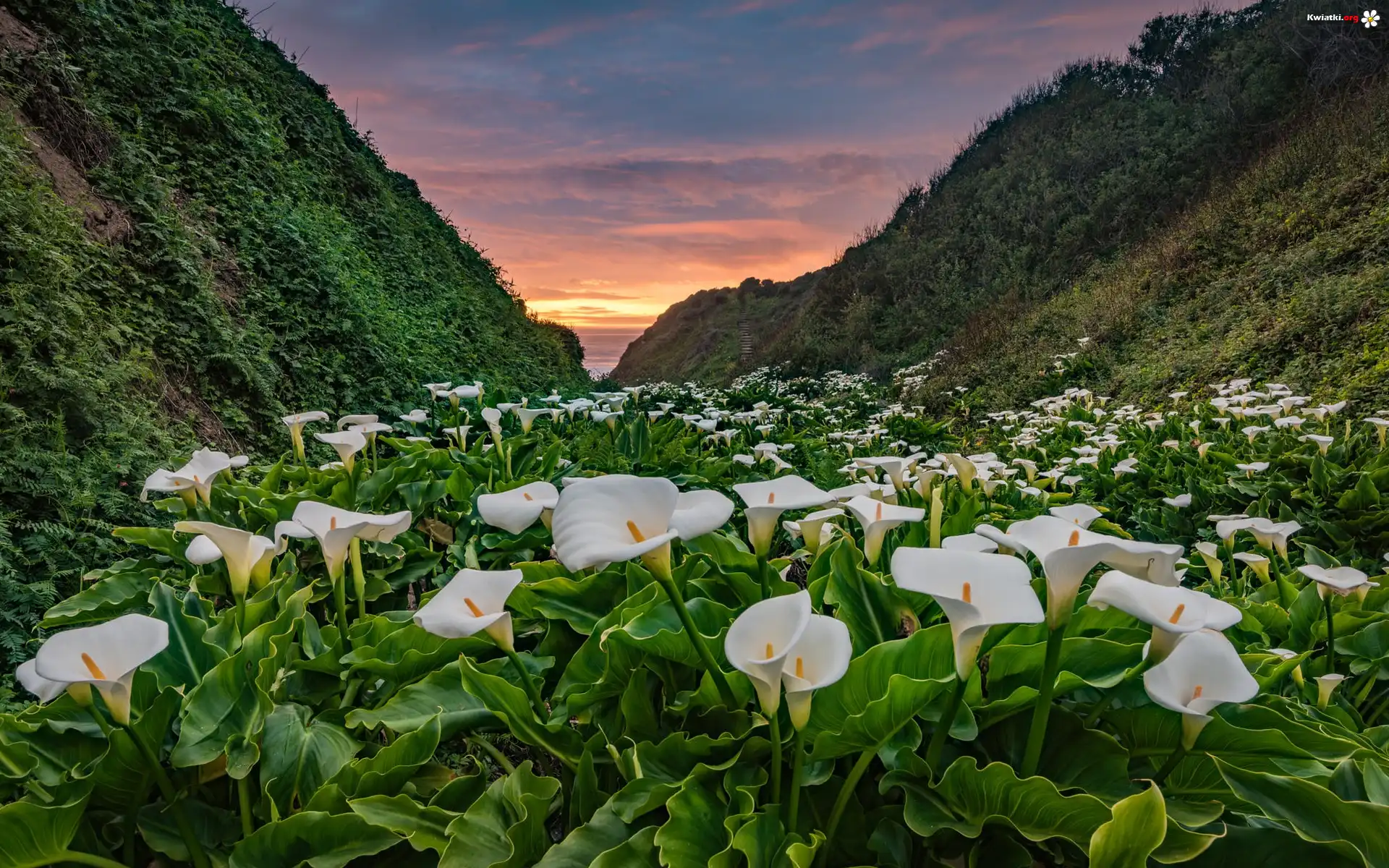Stany Zjednoczone, Kalifornia, Park stanowy Garrapata, Góry, Dolina, Kwiaty, Kalie, Zachód słońca - Zdjęcia |