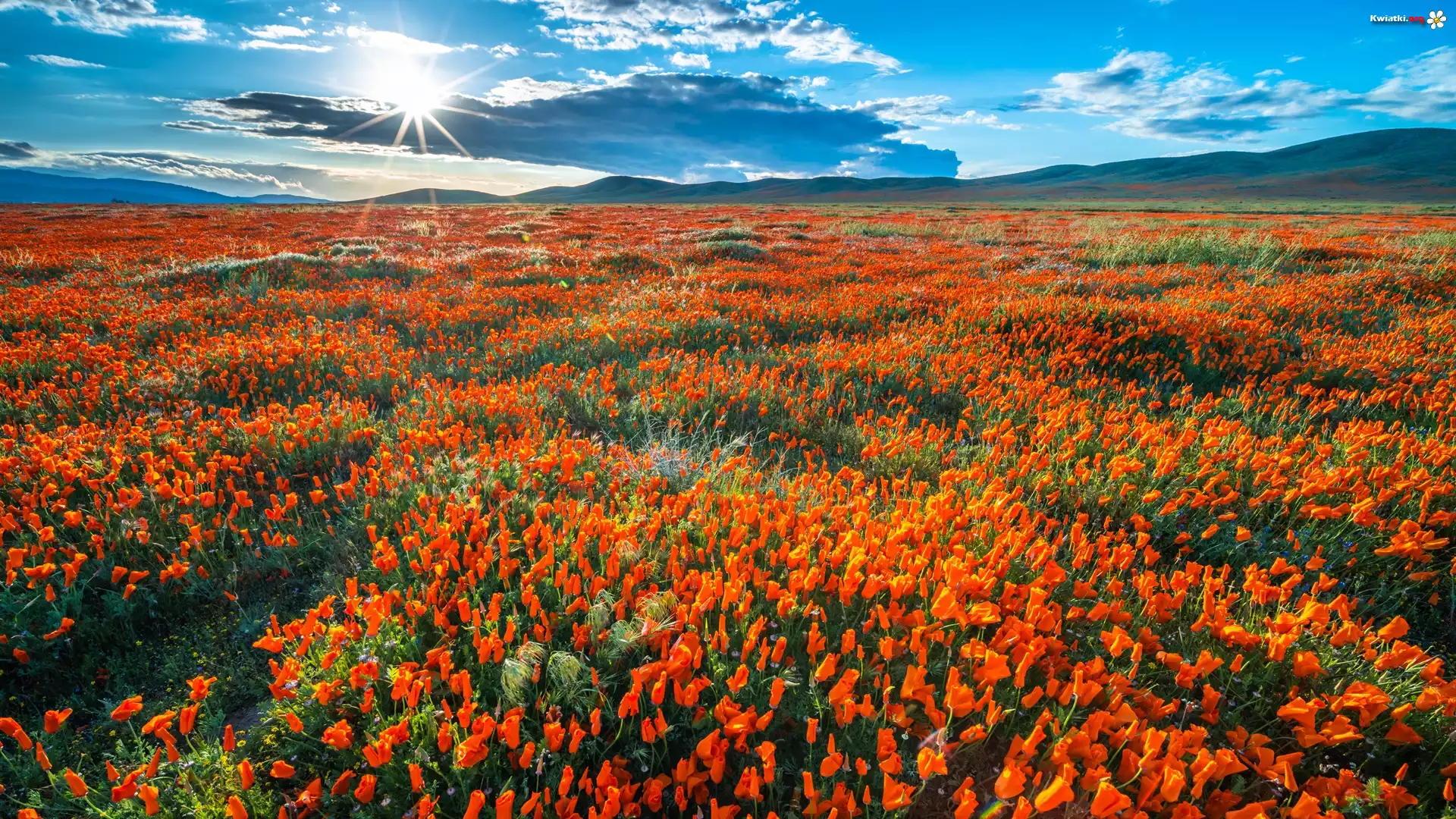 Stany Zjednoczone, Kalifornia, Łąka, Kwiaty, Pozłotki, Maczki kalifornijskie, Promienie słońca, Chmury - Zdjęcia |