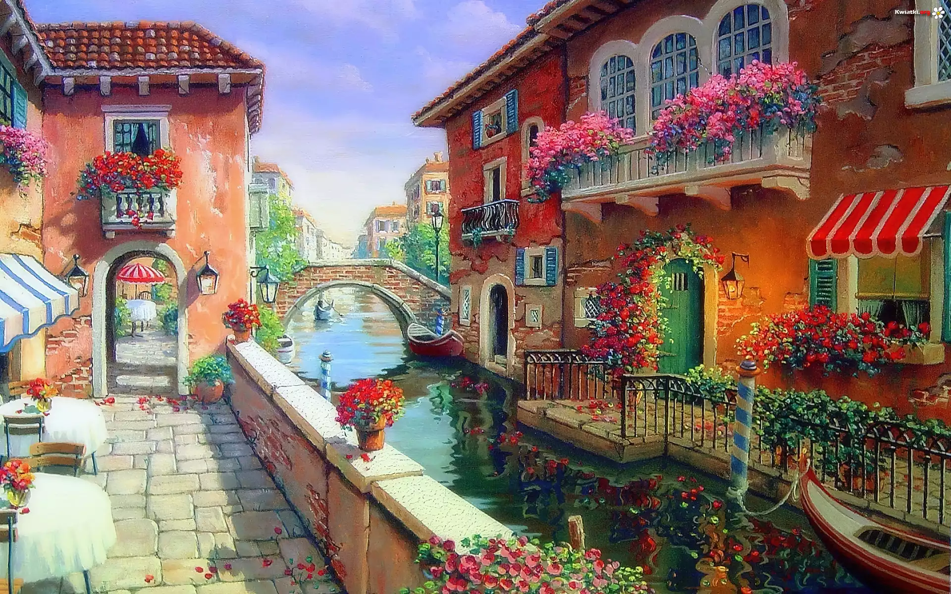 Kwiat Kanał, Gondole, Domy, Kwiaty, Wenecja, Obraz