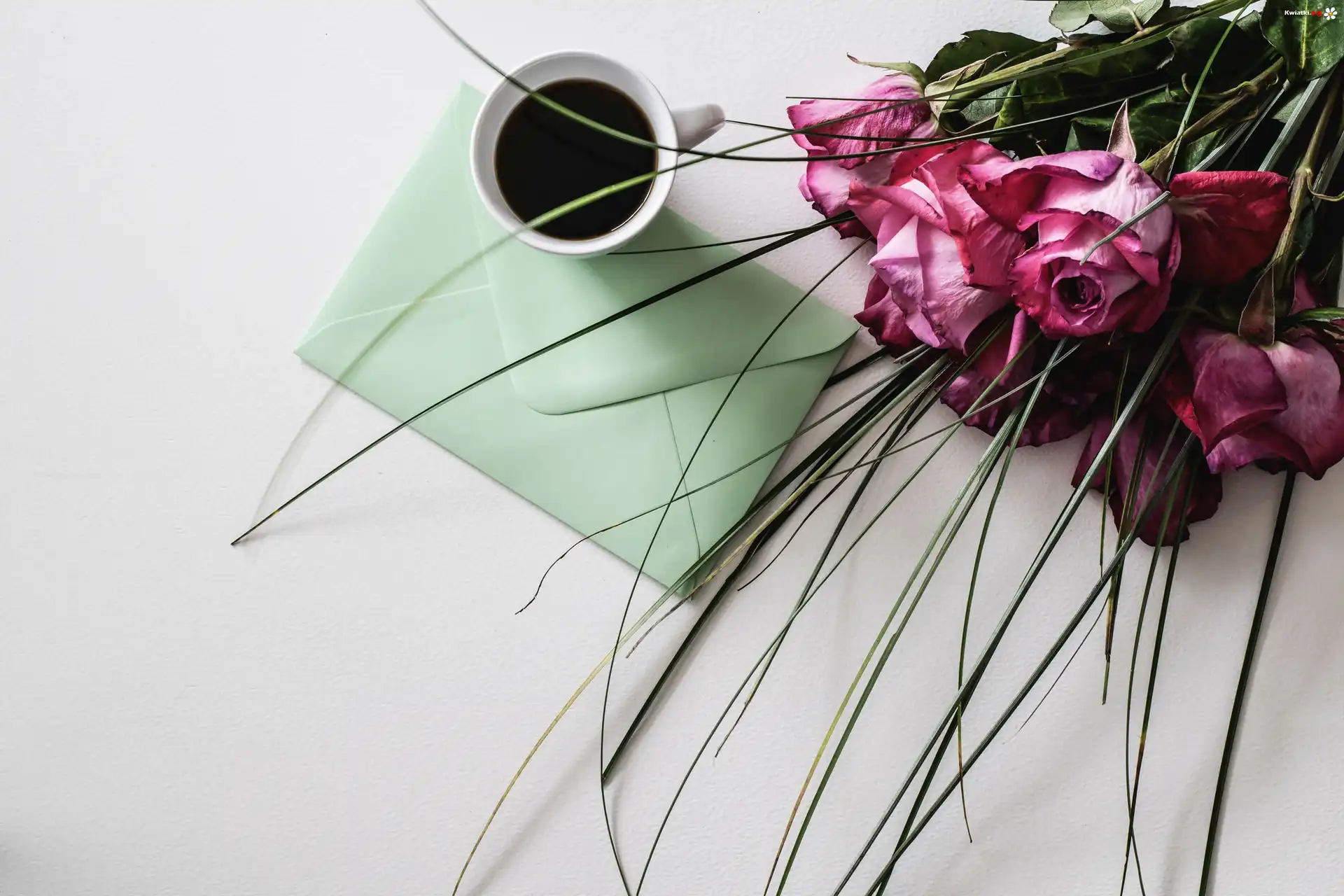 Kawa, Filiżanka, Bukiet, Róże, Koperta - Zdjęcia
