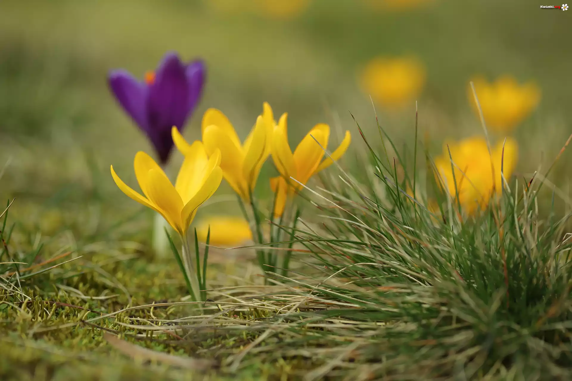 Żółte, Krokusy, Kwiaty, Kępka, Trawy - Zdjęcia