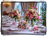 Róże, Bukiety, Stół, Kieliszki, Grafika AI - Zdjęcia