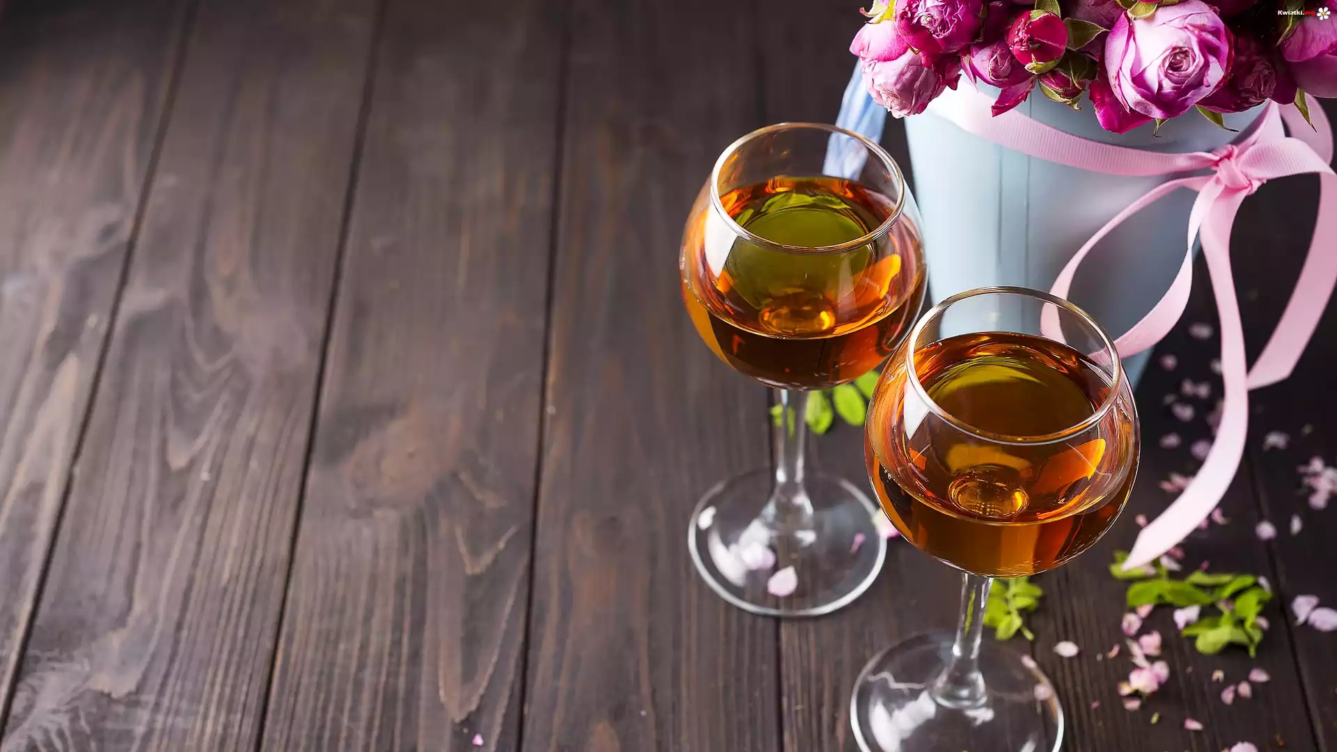 Kwiat Dwa, Kieliszki, Wino, Róże, Bukiet, Wstążka, Deski
