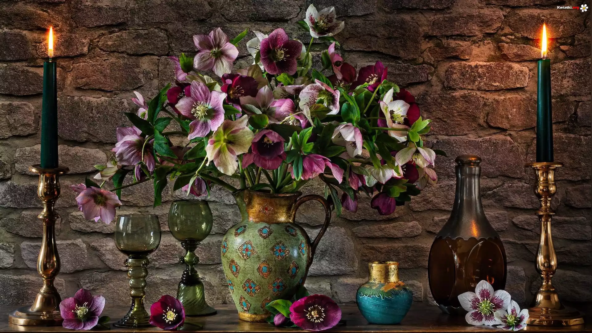 Kompozycja, Bukiet kwiatów, Ciemierniki, Świeczniki, Świece, Karafka, Kieliszki - Zdjęcia