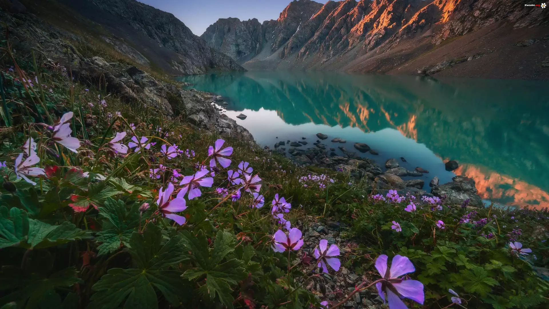 Kwiaty, Góry Tienszan, Jezioro Ala-Kul, Odbicie, Skały, Kirgistan - Zdjęcia