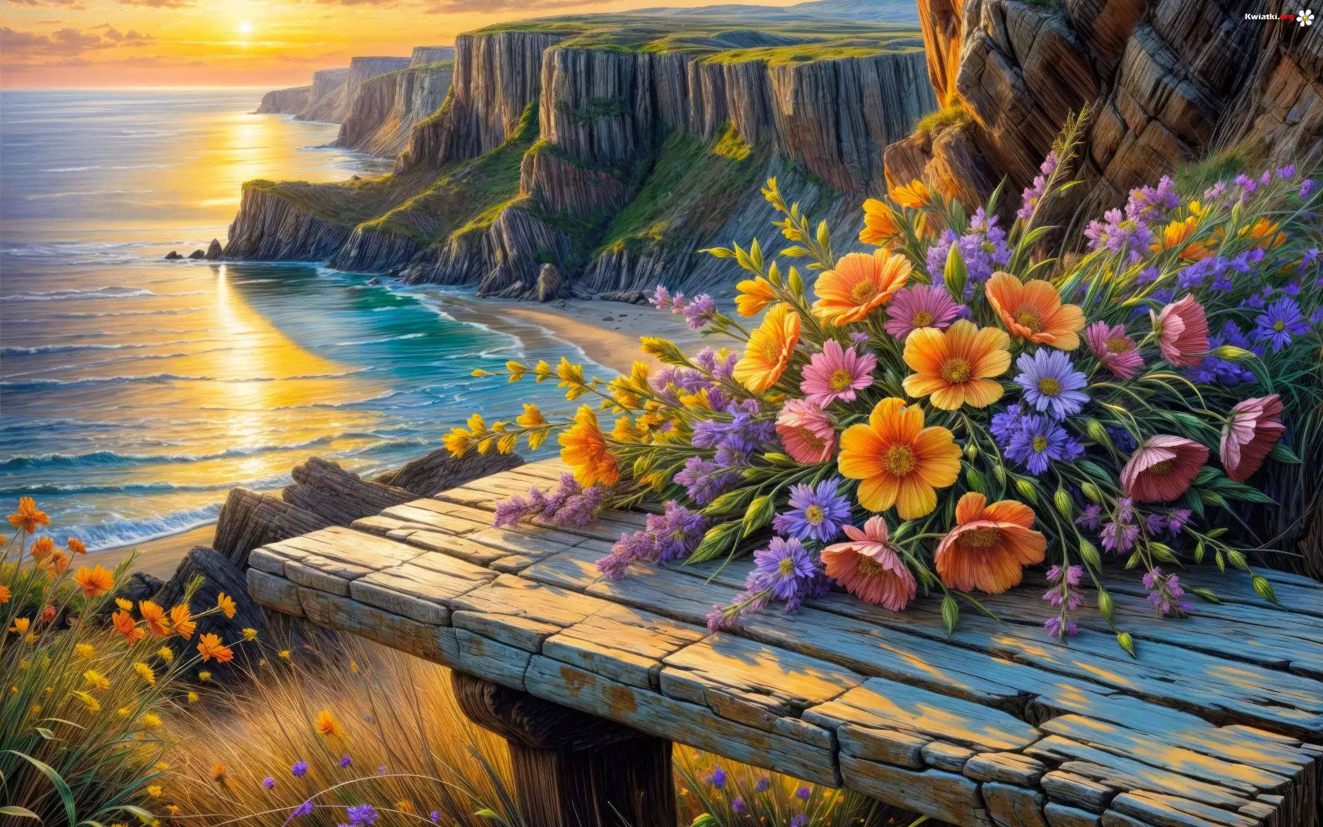 Morze, Kwiaty, Podest, Klify, Zachód słońca, Grafika - Zdjęcia