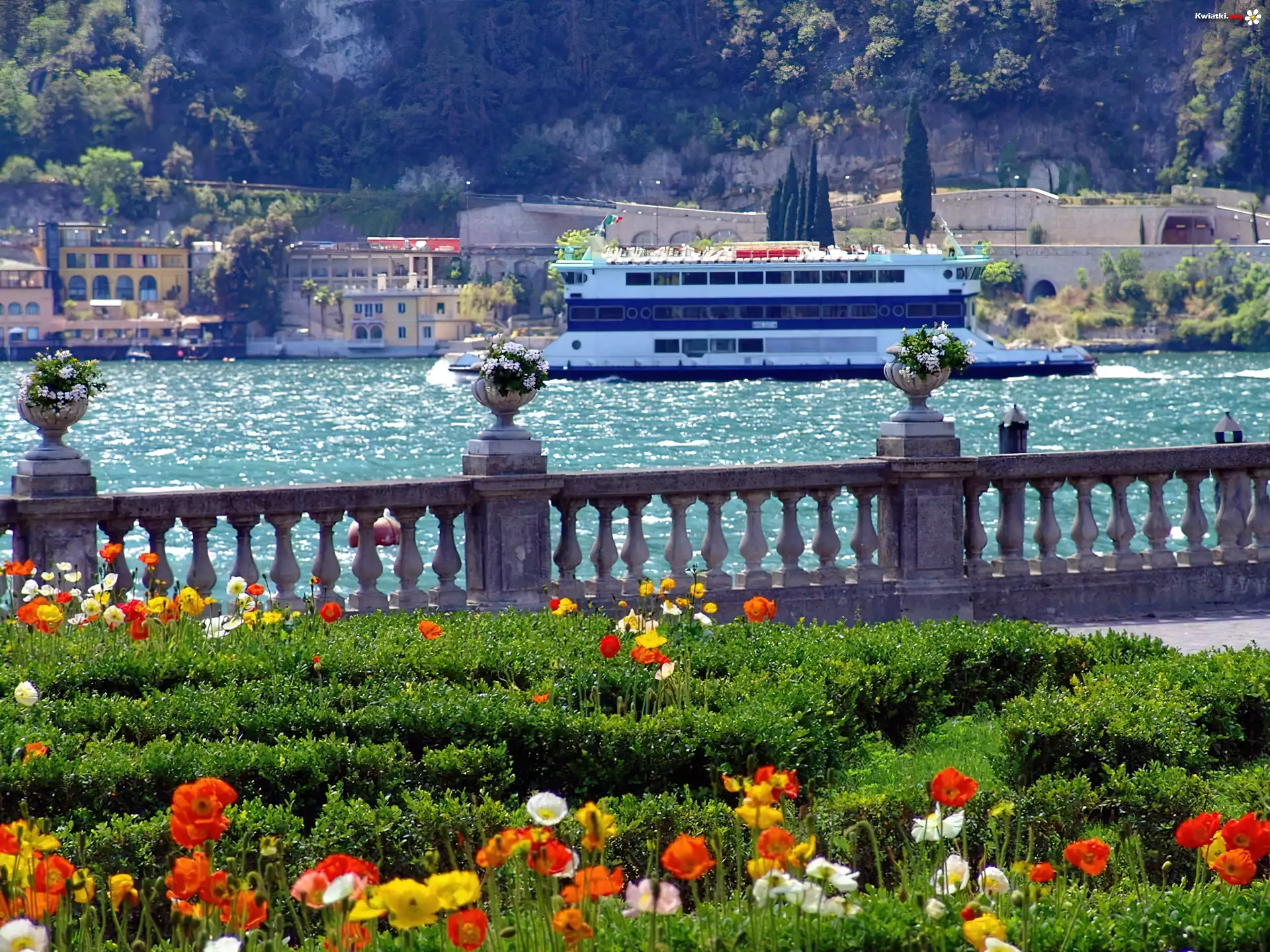 Klomb, Kwiaty, Balustrada, Rzeka - Zdjęcia