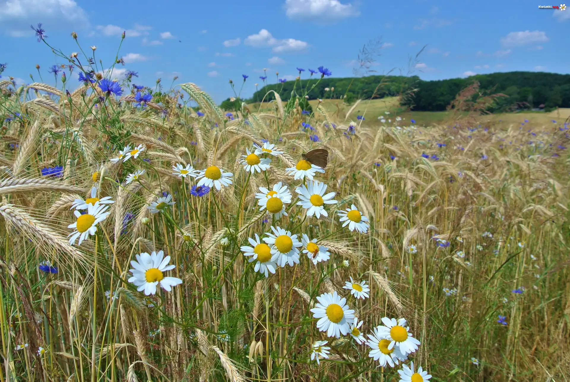 Pole, Kłosy, Zboże, Kwiaty, Rumian polny, Chabry, Motyl - Zdjęcia