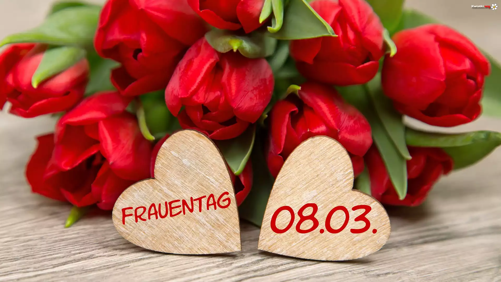 Kwiat Dzień Kobiet, Bukiet, Czerwone, Tulipany, Serca, Napis