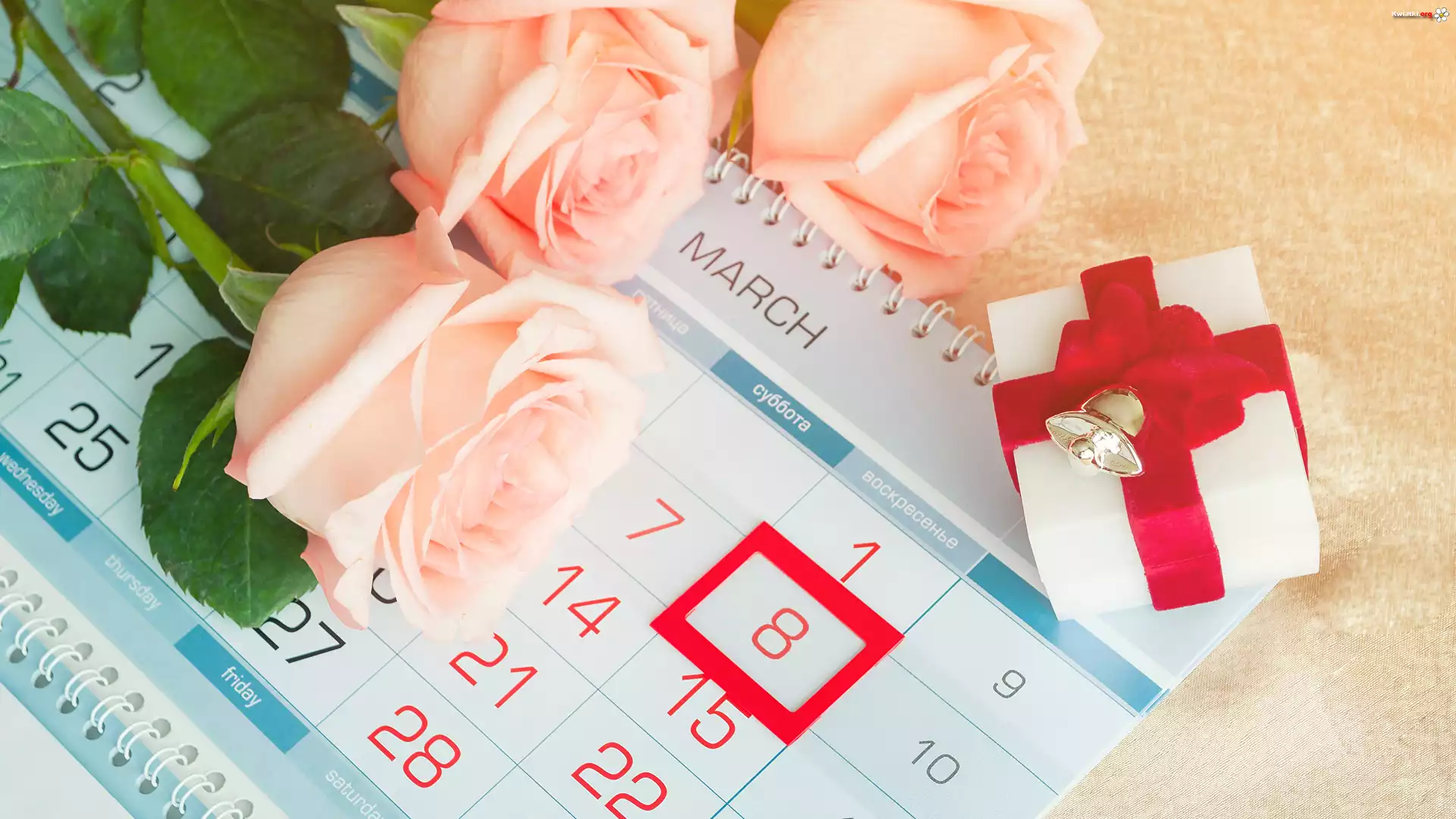 Dzień kobiet, Bukiet, Trzy, Róże, Kalendarz, Prezent - Zdjęcia