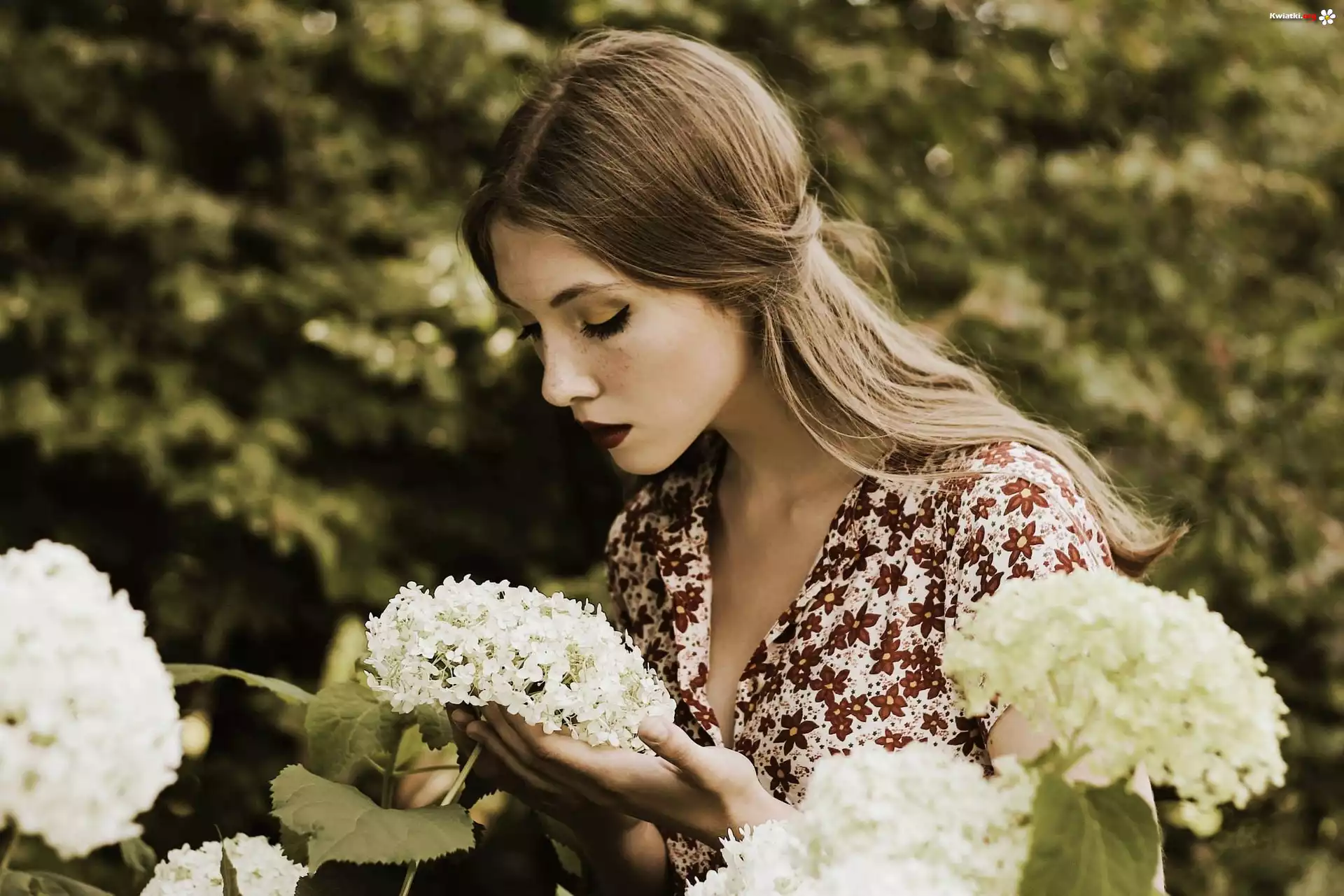 Kwiat Kobieta, Blondynka, Makijaż, Białe, Kwiaty