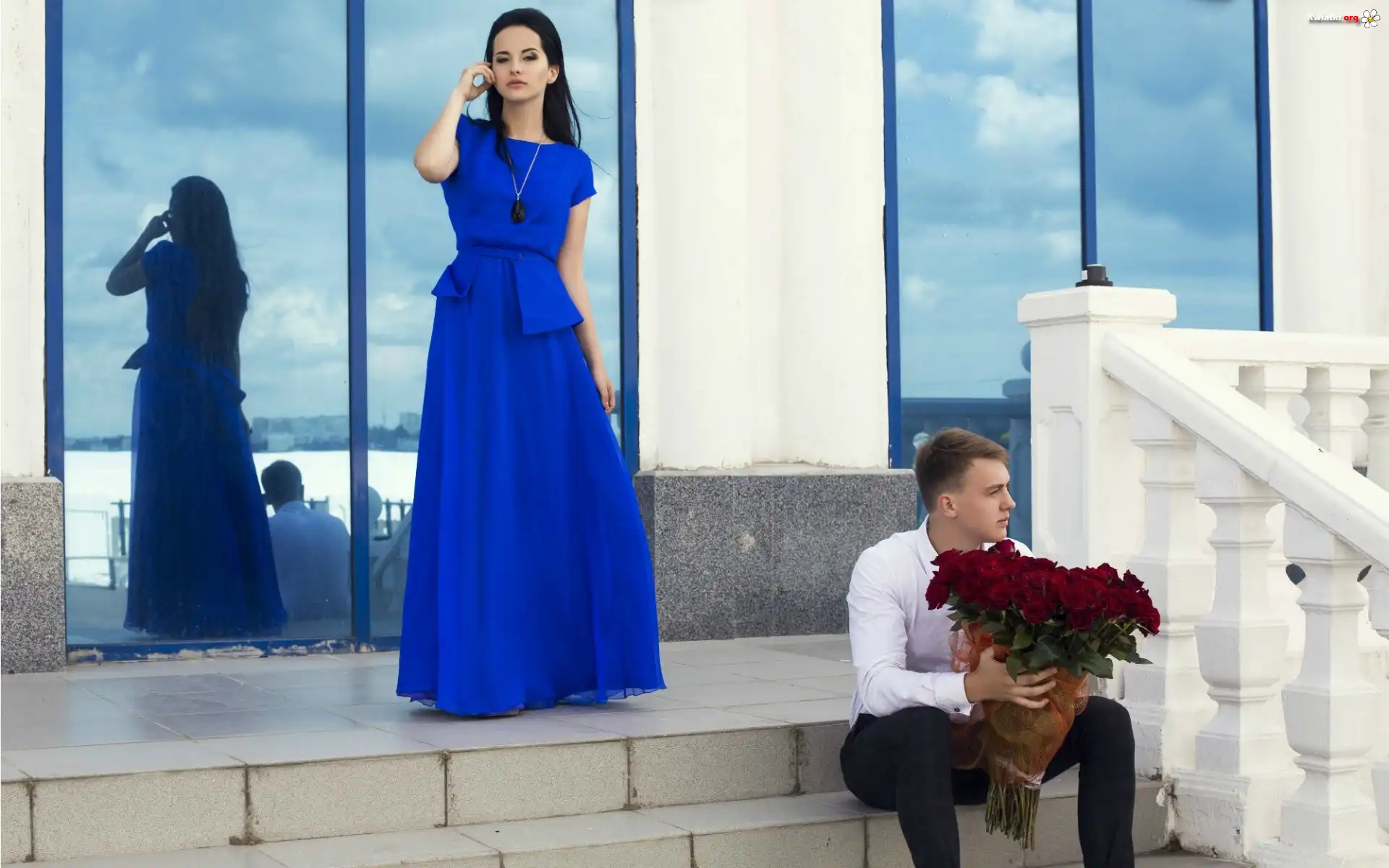 Kwiat Kobieta, Mężczyzna, Bukiet, Róż, Budynek, Schody