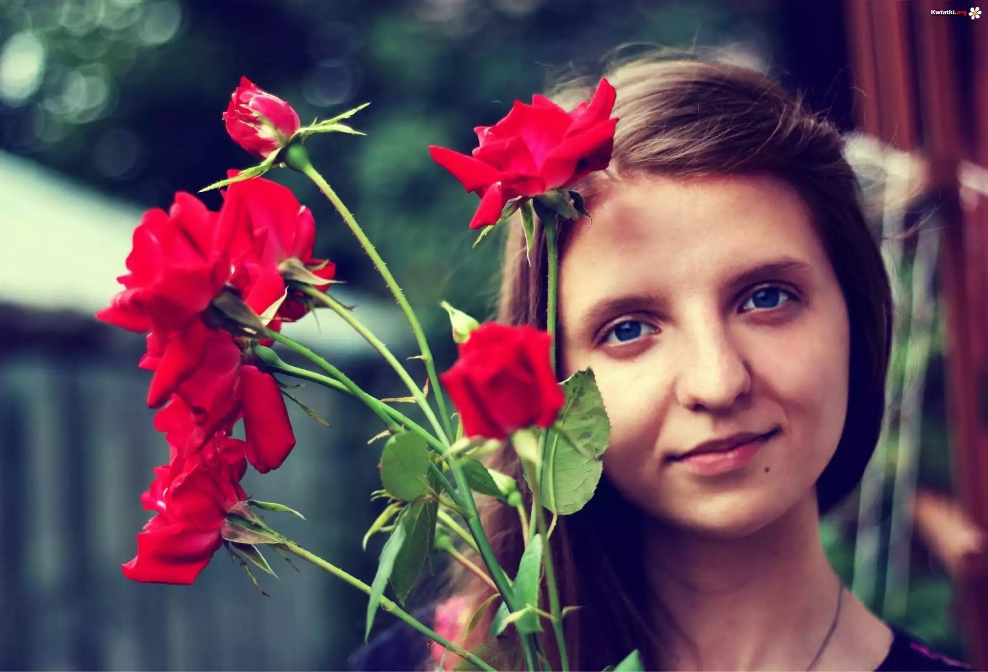 Kobieta, Niebieskie, Oczy, Czerwone, Kwiaty - Zdjęcia