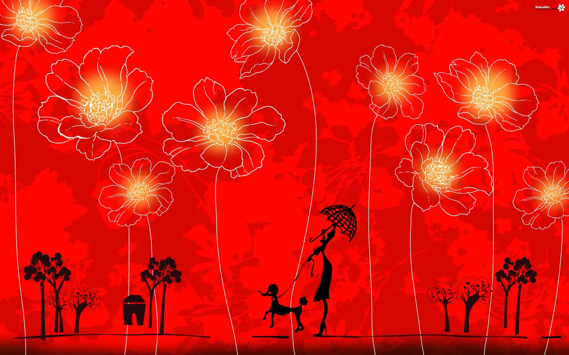 Kwiat Kobieta, Parasol, Pies, Drzewa, Kwiaty