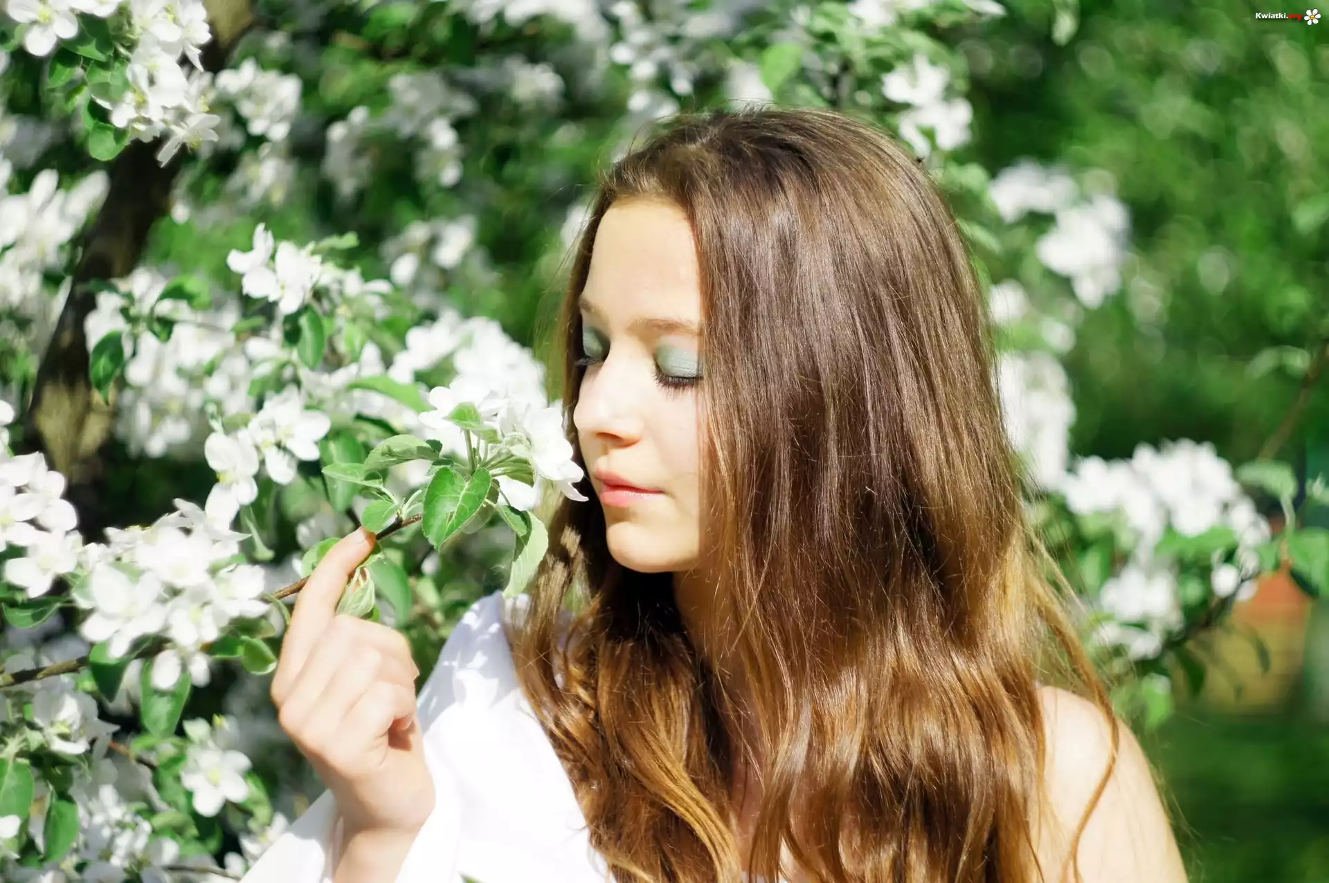 Kobieta, Brunetka, Białe, Kwiaty, Wiśni - Zdjęcia