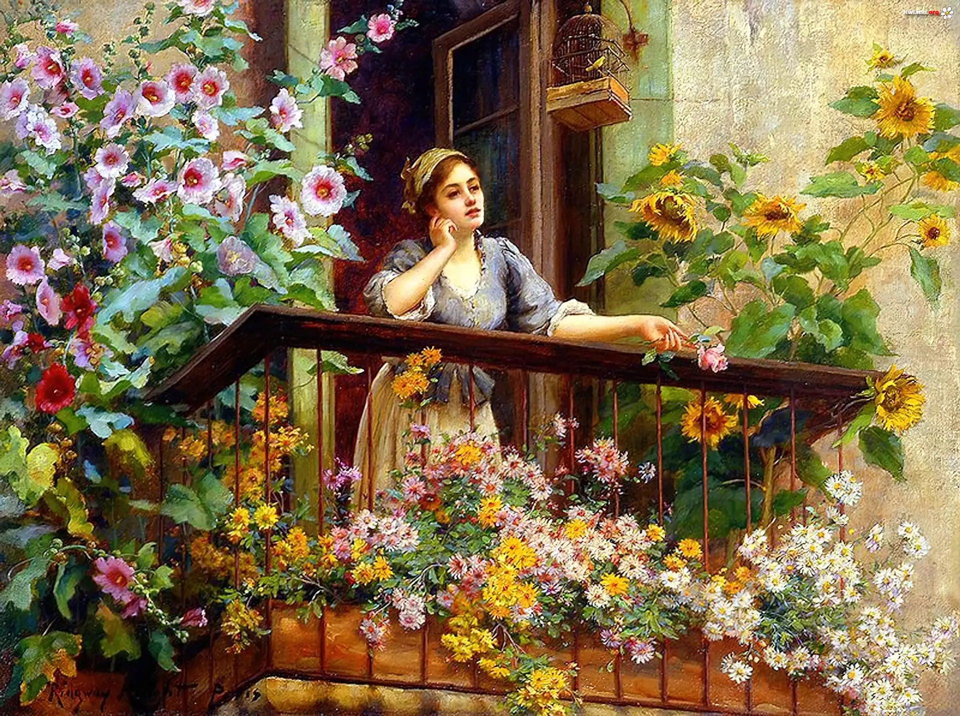 Kobieta, Kwiaty, Balkon, Reprodukcja, Obrazu - Zdjęcia