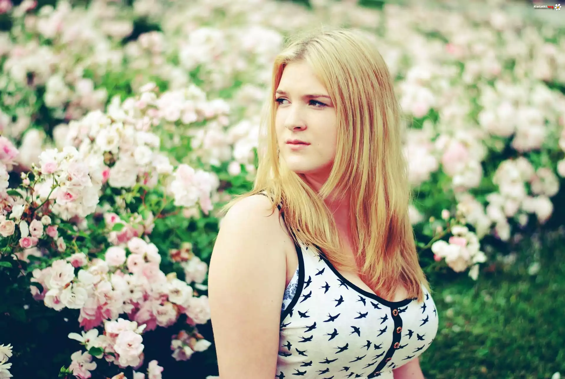 Kwiat Kobieta, Blondynka, Różowe, Kwiaty