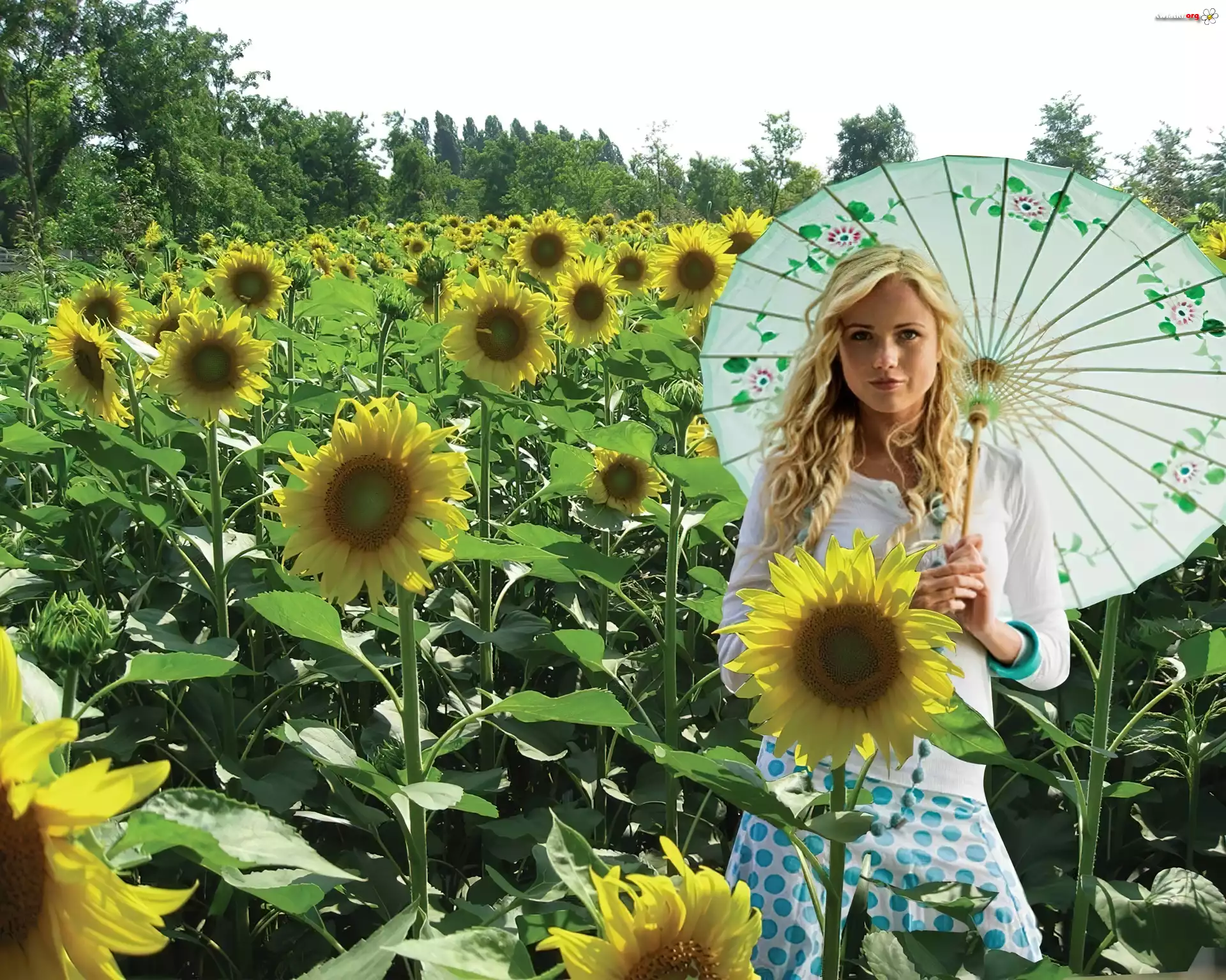 Kwiat Kobieta, Blondynka, Pole, Słoneczniki, Parasolka