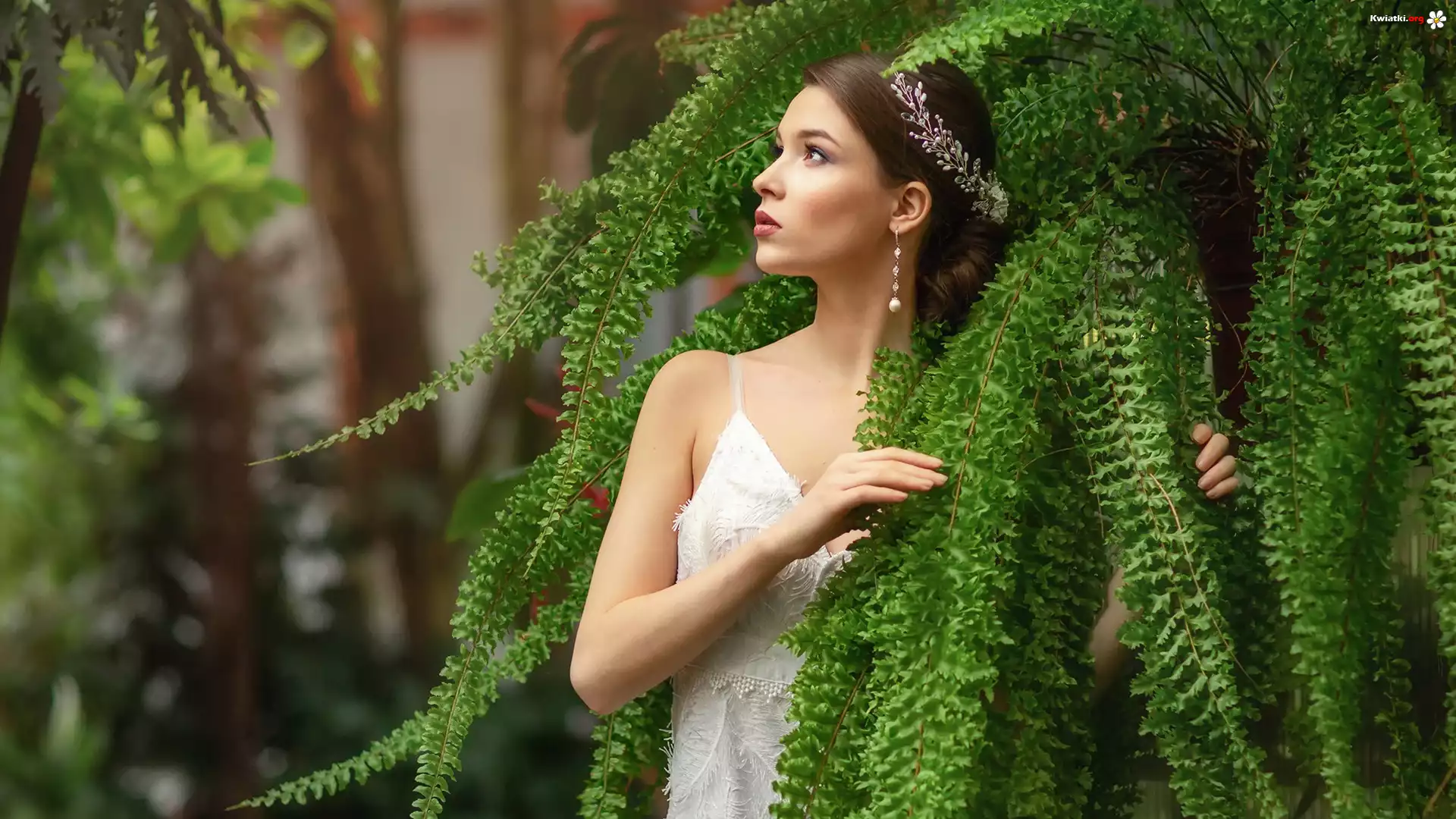 Kobieta, Kolczyki, Biała, Sukienka, Paprocie - Zdjęcia