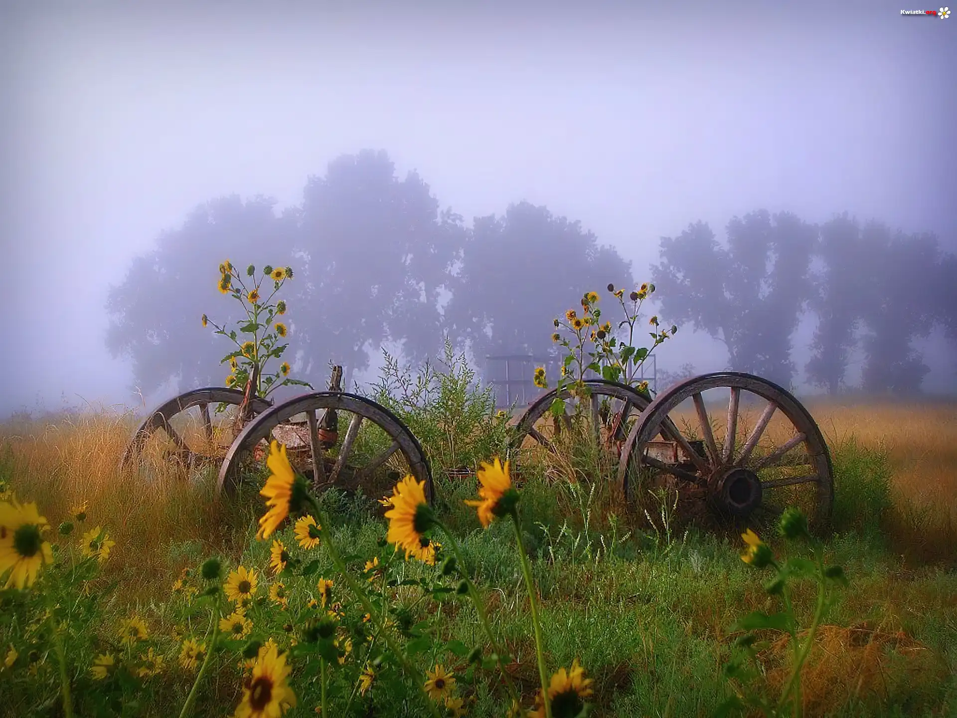 Kwiat Koła, Wóz, Słoneczniki, Mgła