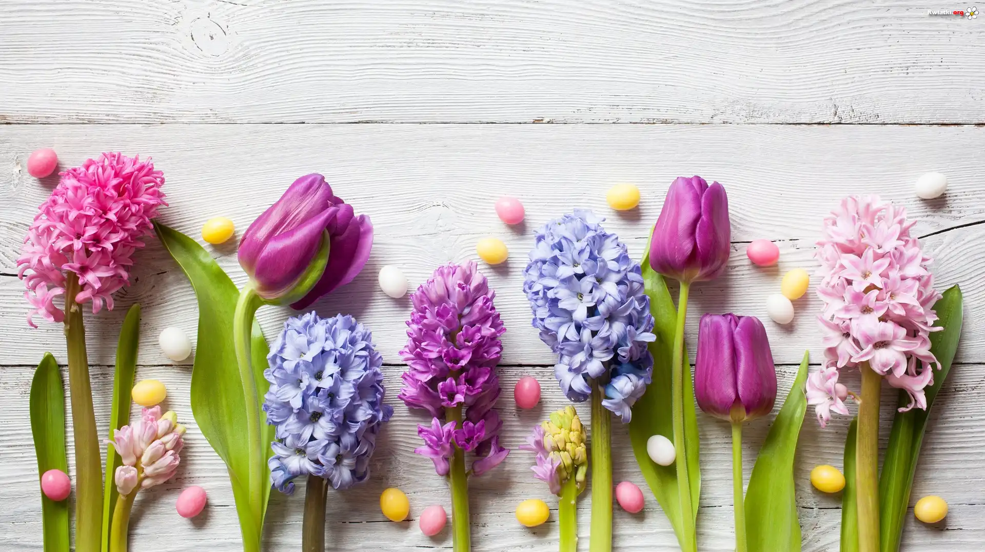 Kwiaty, Hiacynty, Tulipany, Kolorowe, Cukierki, Deski - Zdjęcia