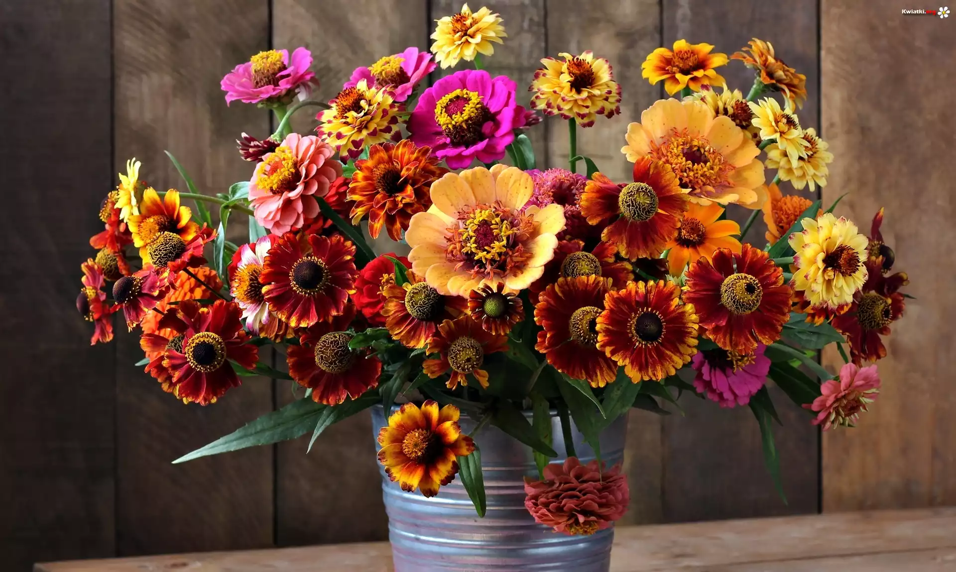 Kwiat Bukiet, Kolorowe, Kwiaty, Dzielżany, Cynie, Wiaderko, Deski