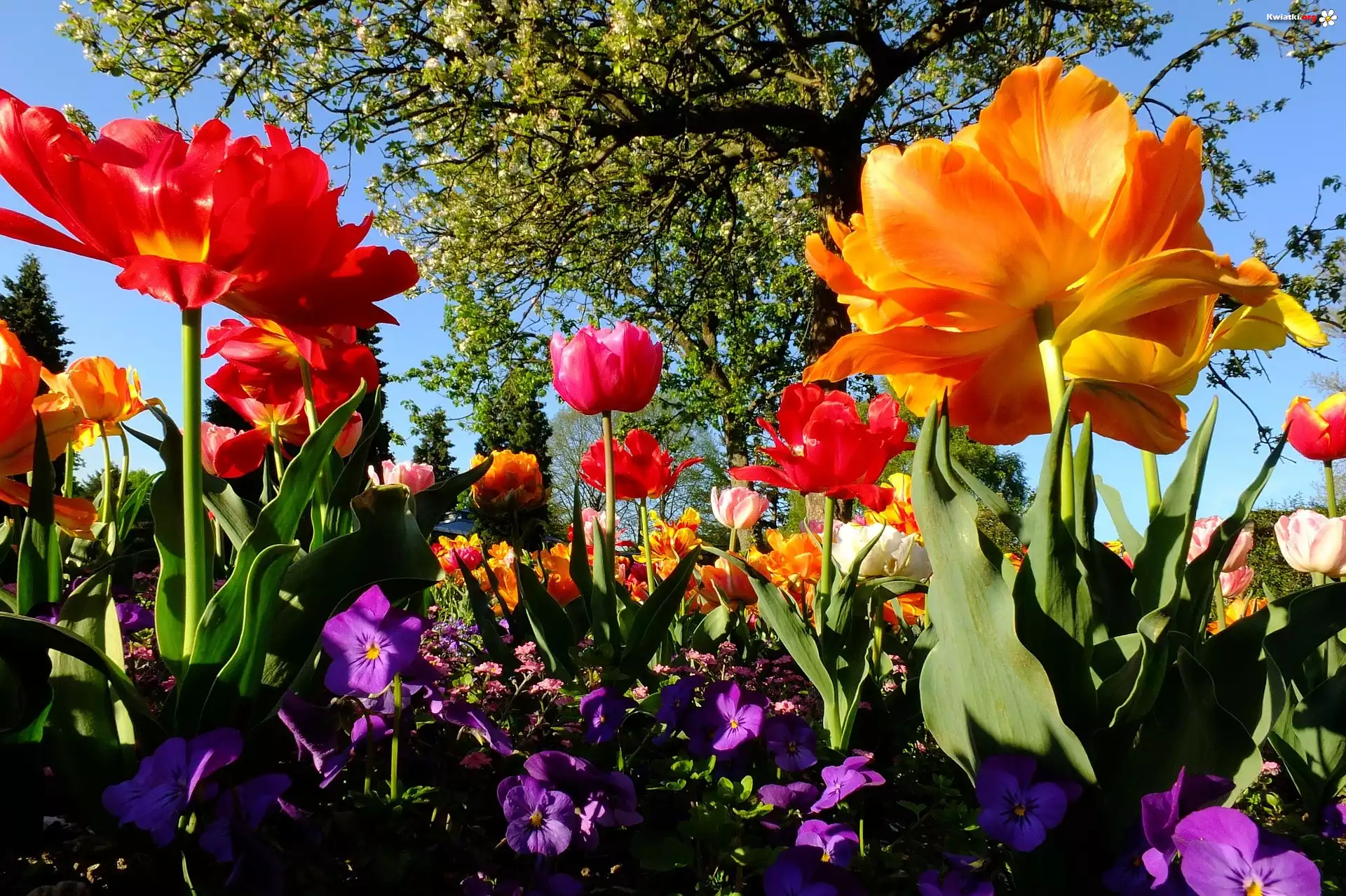 Kwiat Kolorowe, Tulipany, Bratki, Kwitnące, Drzewo, Wiosna