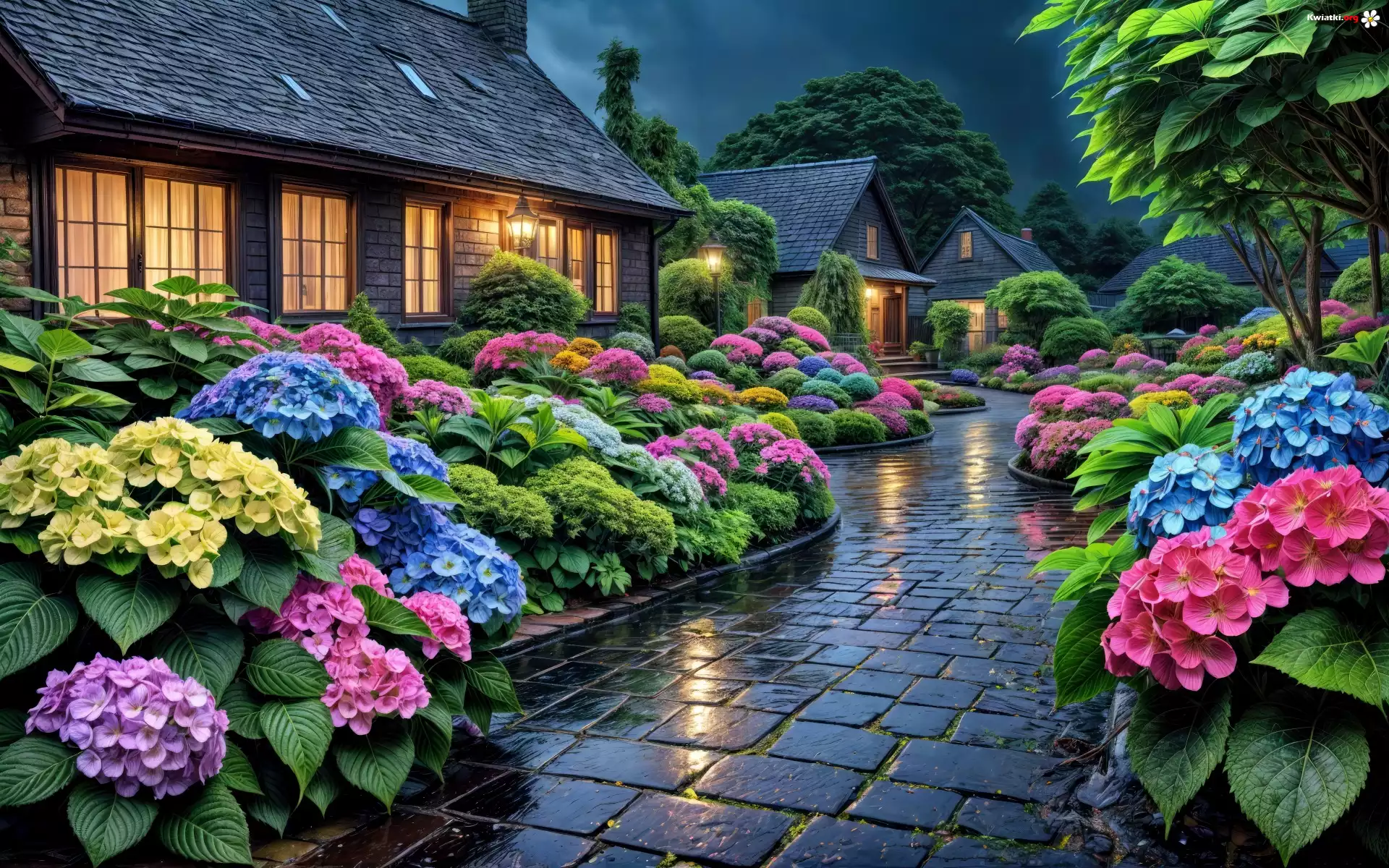 Kwiat Domy, Kolorowe, Hortensje, Droga, Grafika
