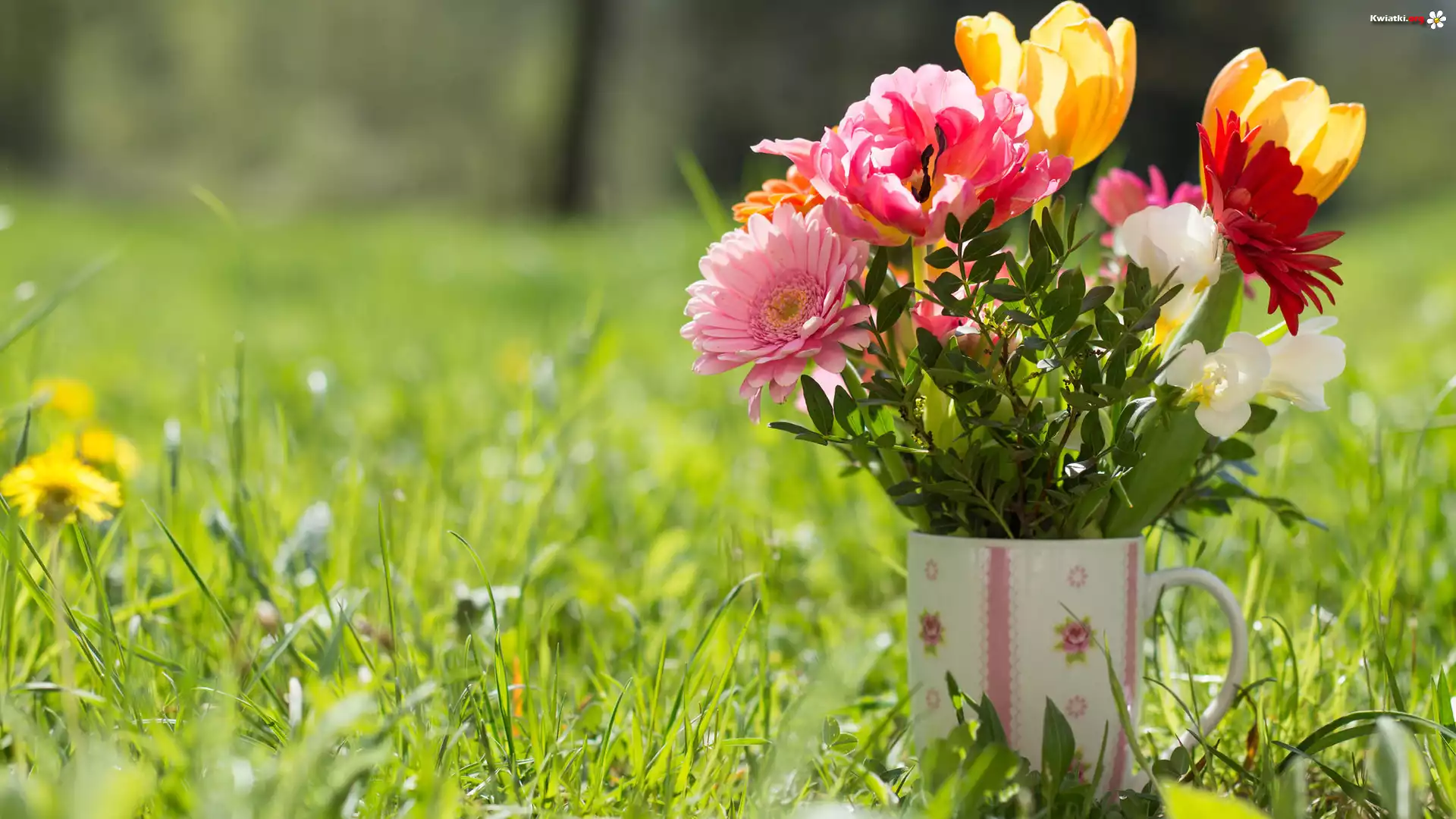 Kolorowe, Kwiaty, Kubek, Trawa - Zdjęcia