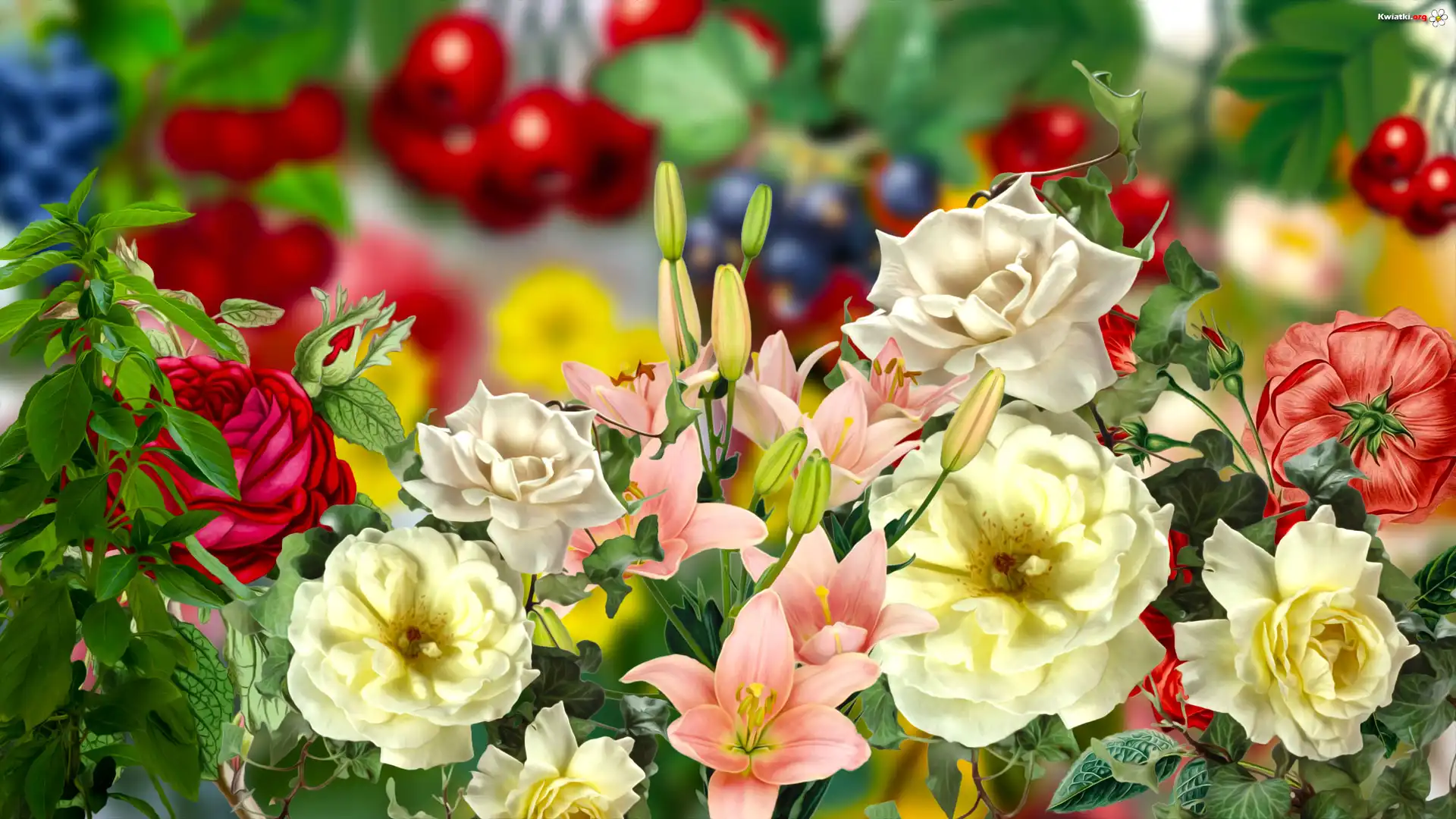 Kolorowe, Kwiaty, Róże, Lilie, Grafika - Zdjęcia