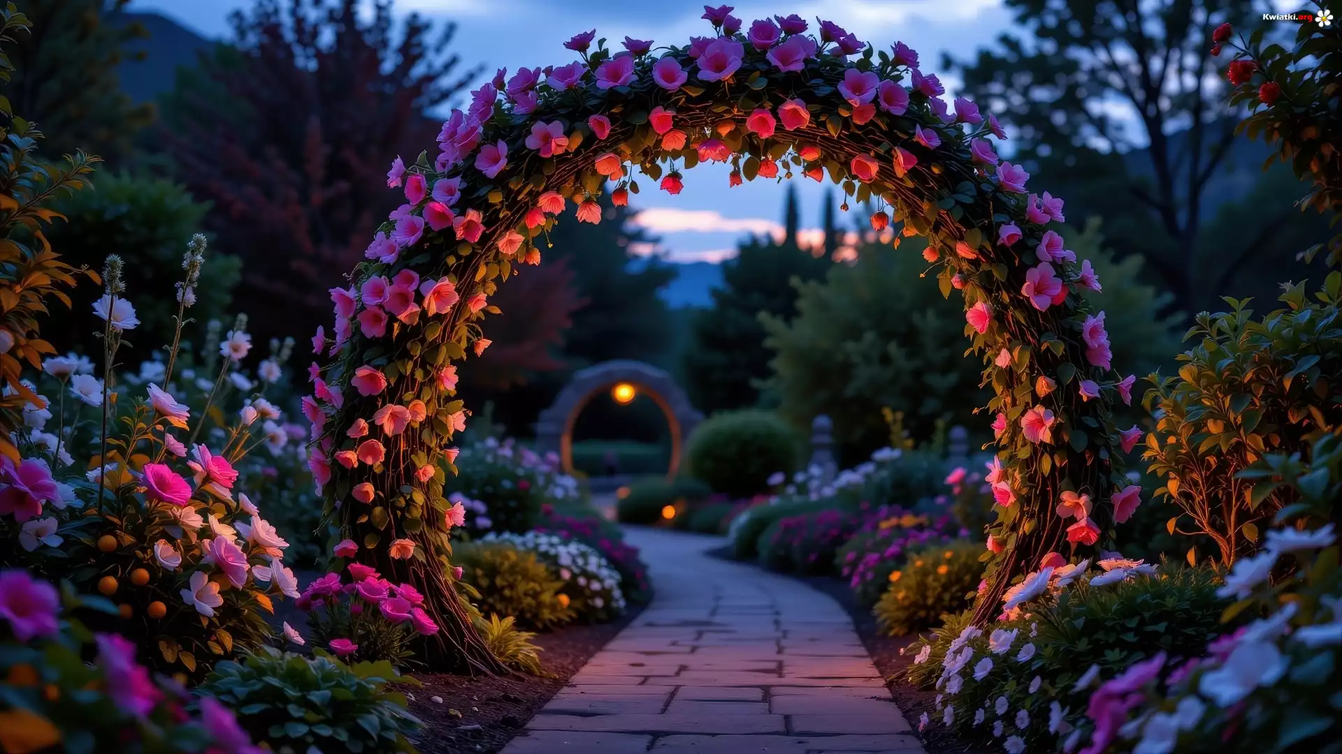 Ogród, Kwiatowy, Łuk, Kolorowe, Kwiaty, Drzewa, Alejka - Zdjęcia