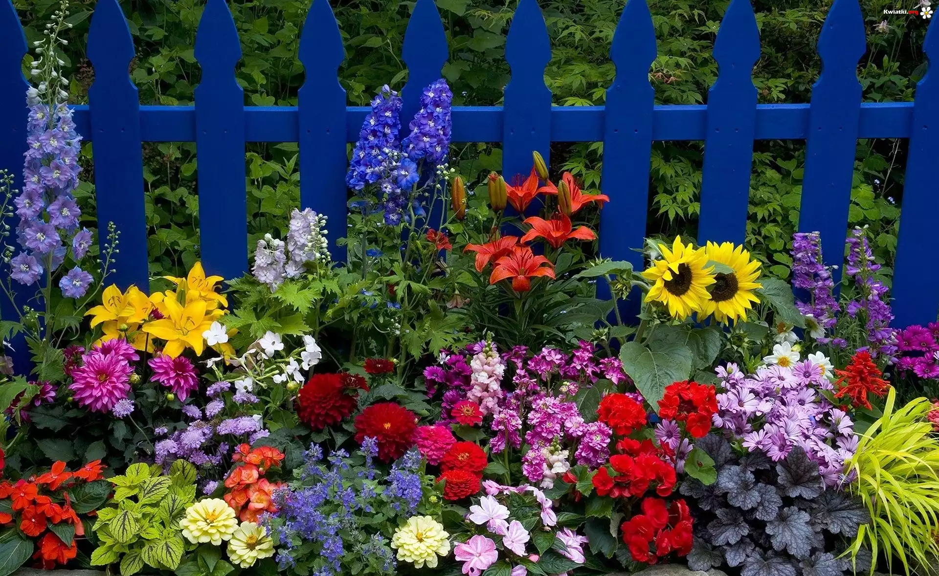Kolorowe, Kwiaty, Niebieski, Płotek - Zdjęcia