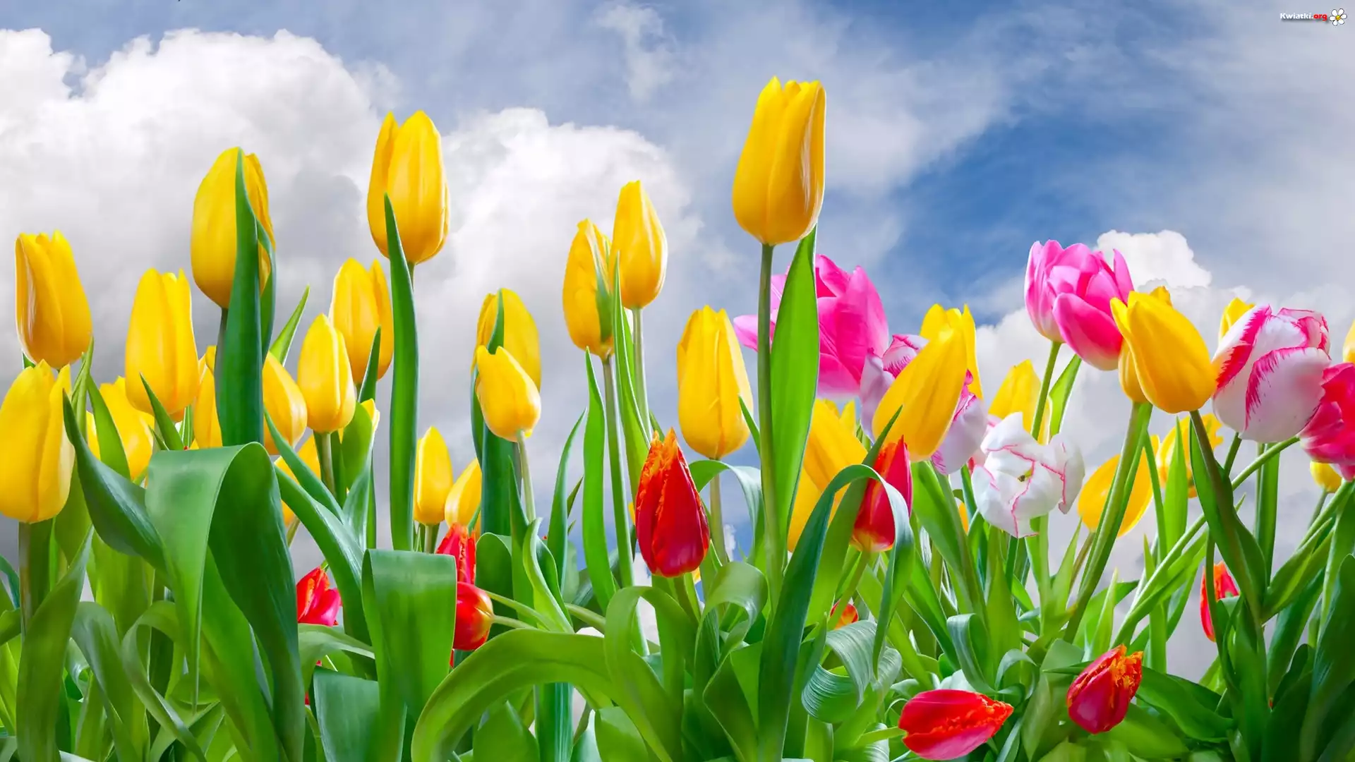 Kwiat Kolorowe, Tulipany, Niebo, Chmury