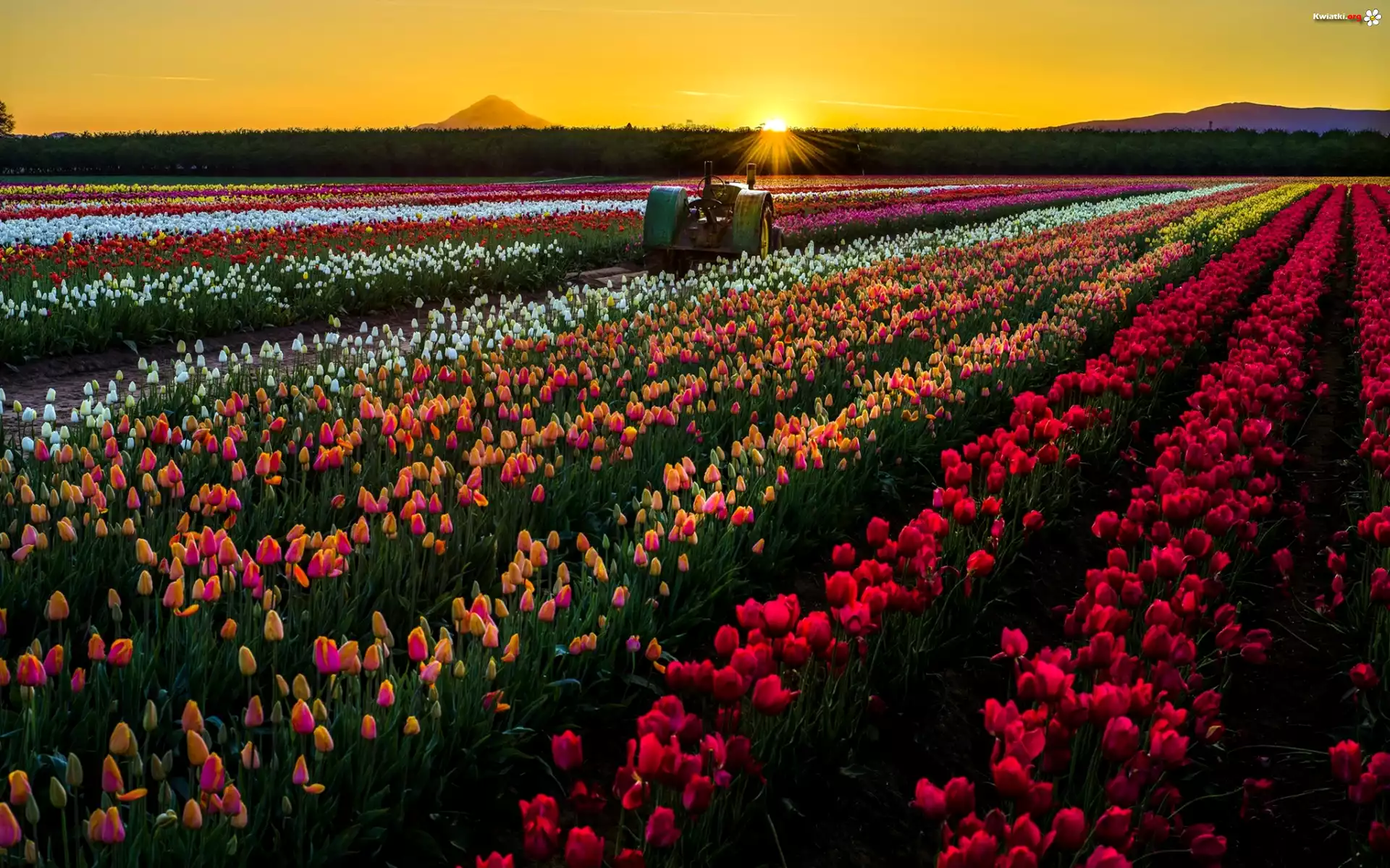 Kwiat Pole, Kolorowe, Tulipany, Zachód, Słońca, Ciągnik, Rolniczy