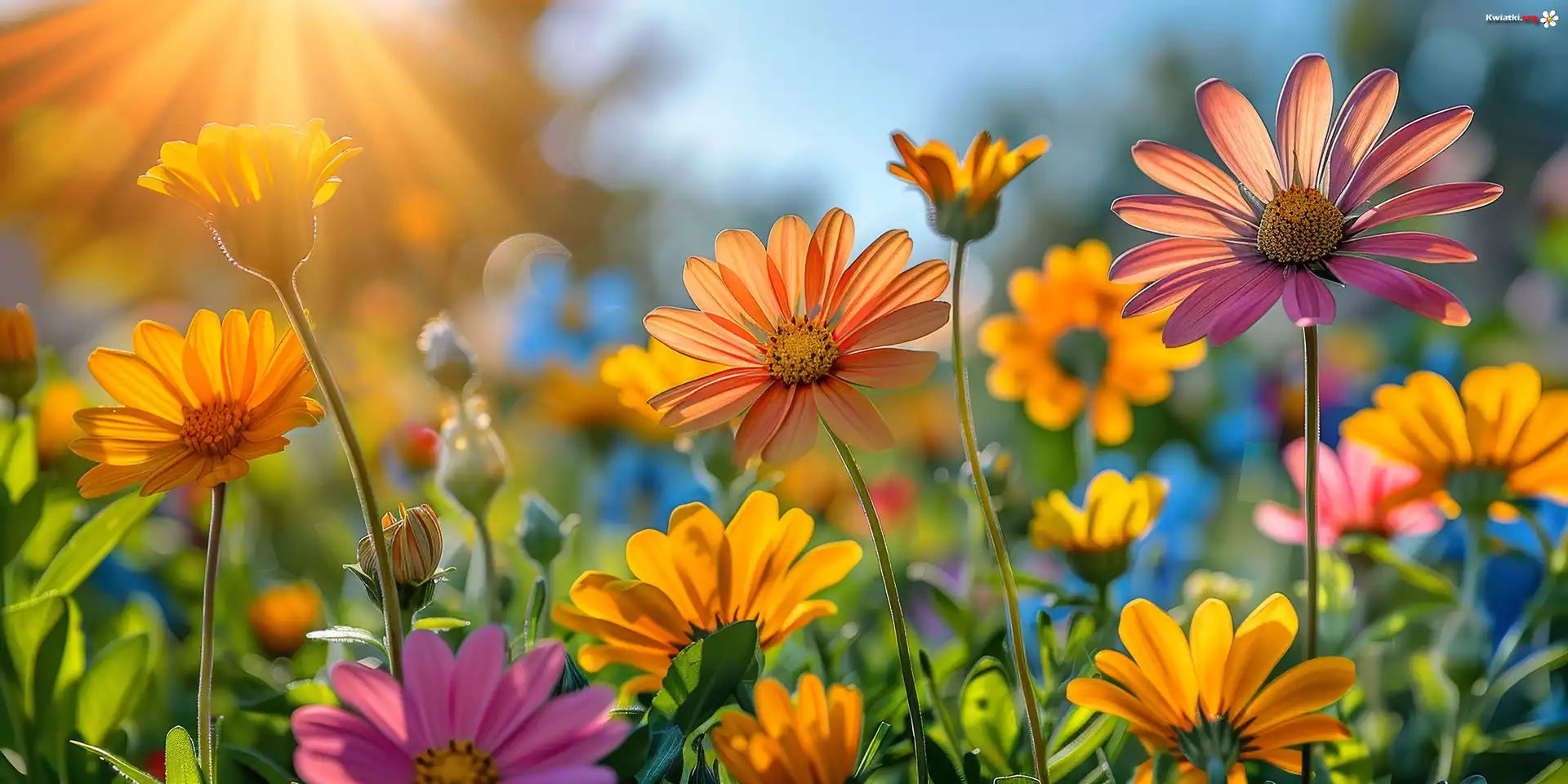 Kwiaty, Kolorowe, Promienie słońca, Grafika - Zdjęcia