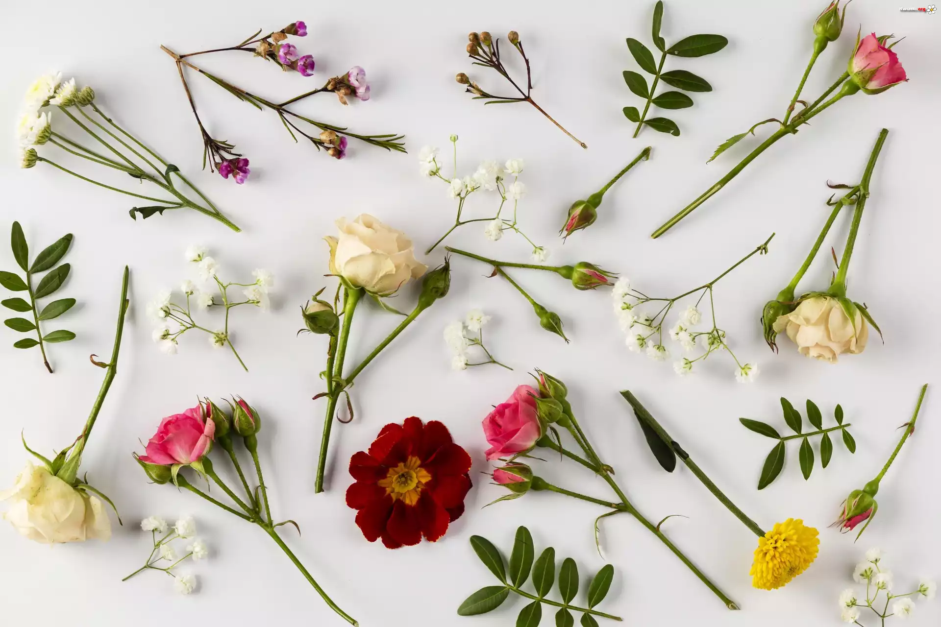 Kwiaty, Kolorowe, Róże, Białe, Gipsówki, Liście, Białe, Tło - Zdjęcia