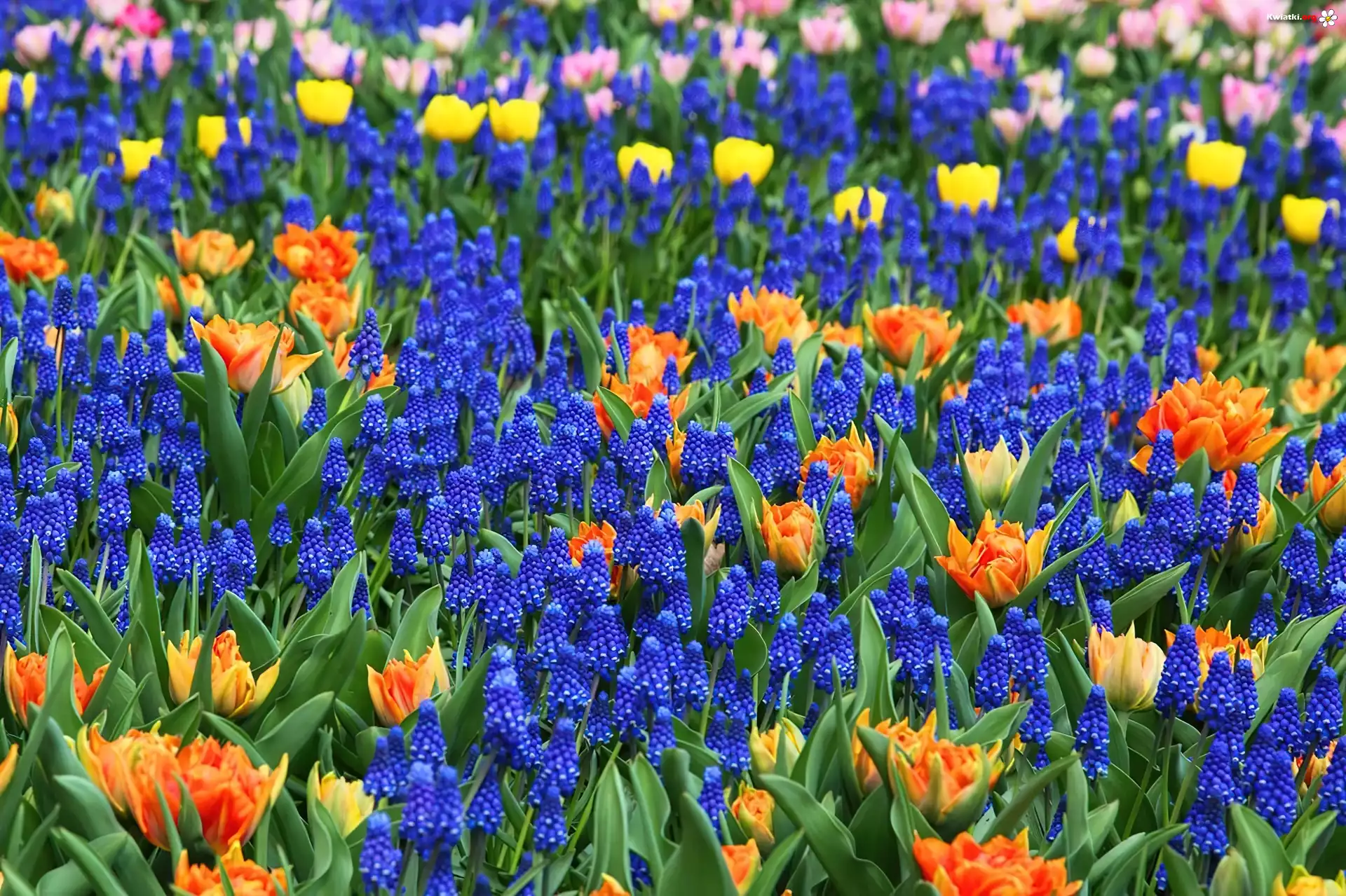 Kolorowe, Kwiaty, Tulipany, Szafirki - Zdjęcia