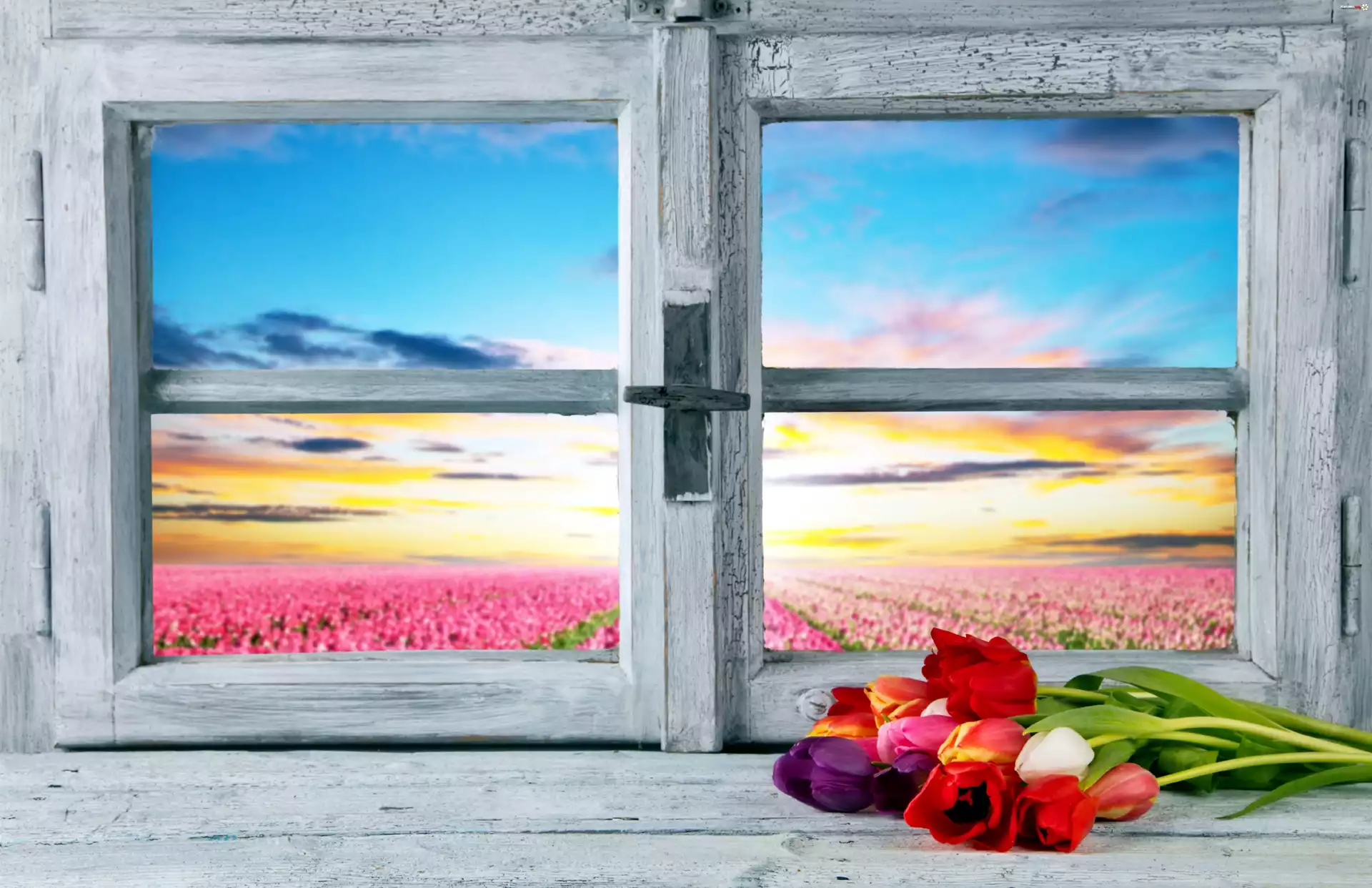Kwiat Bukiet, Kolorowych, Tulipanów, Okno, Widok, Na, Pole