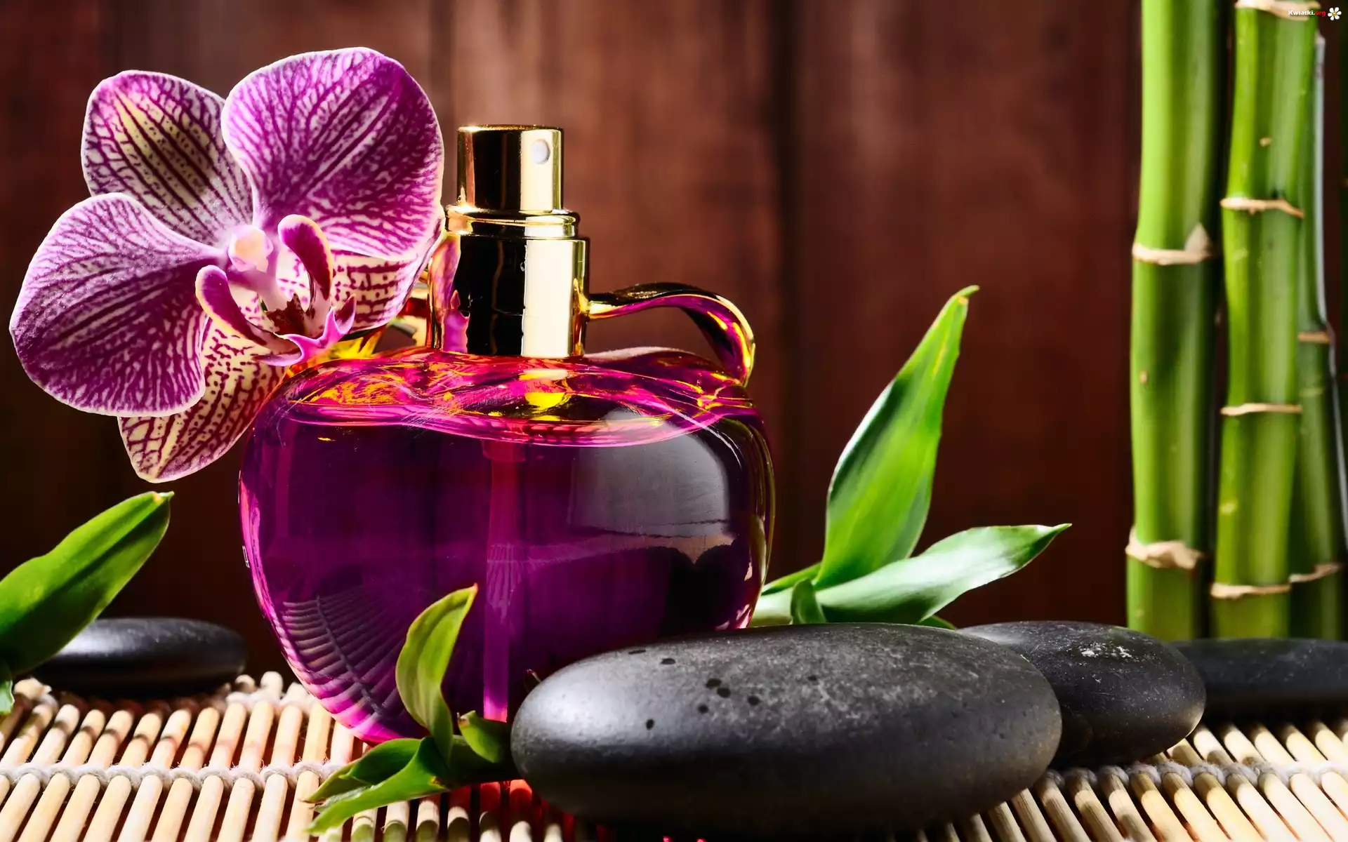 Kompozycja, Storczyki, Kamienie, Bambus, Perfumy - Zdjęcia