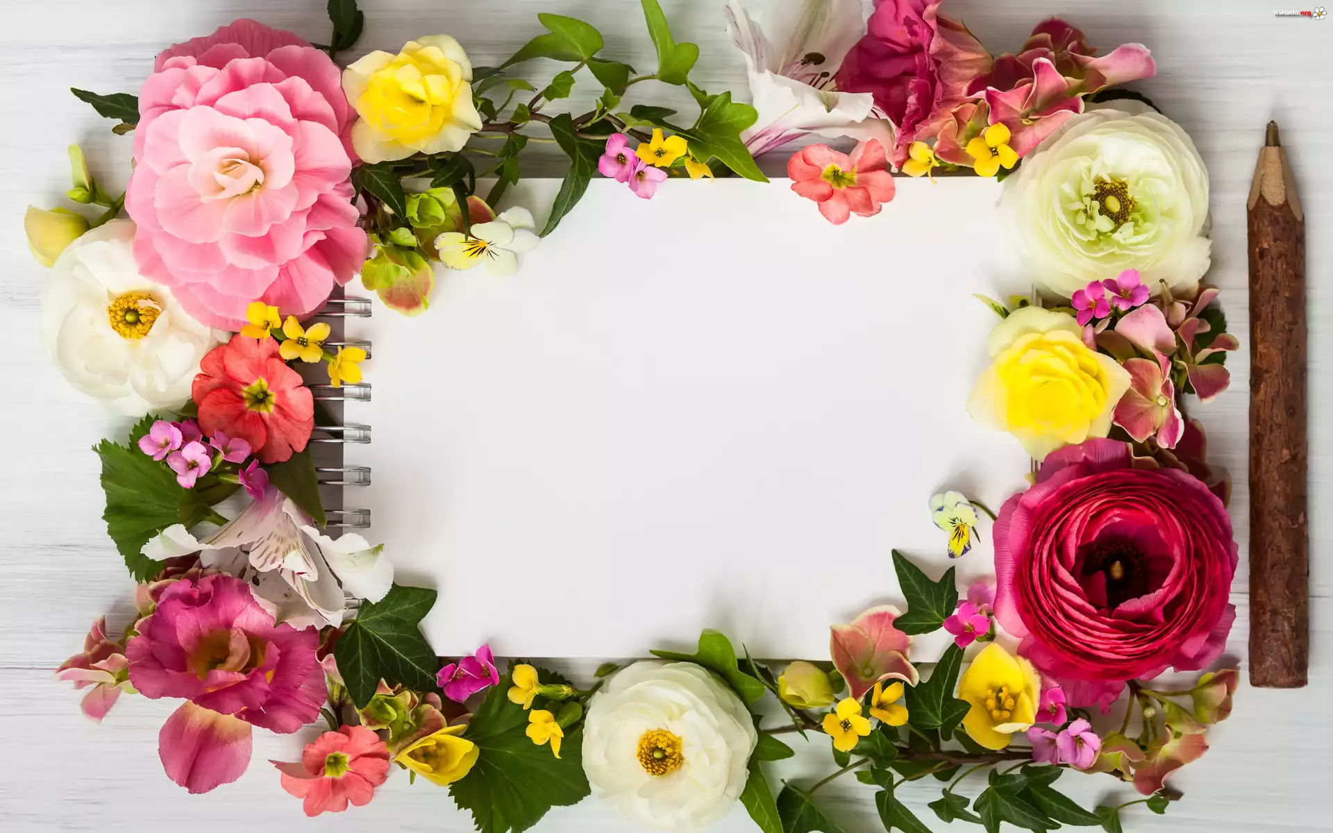 Kompozycja, Kwiaty, Kartka, Brulion, Ołówek - Zdjęcia