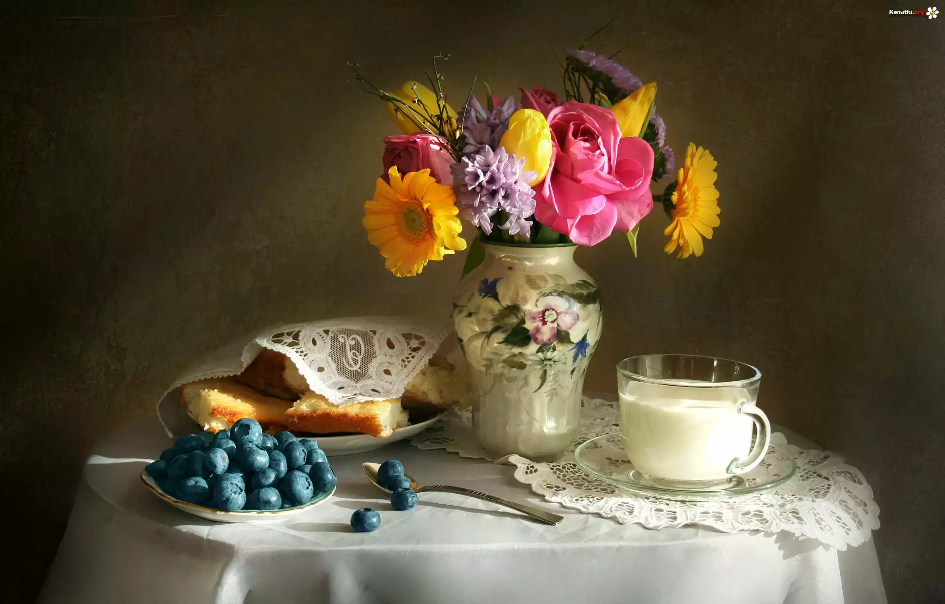 Kompozycja, Kwiaty, Bukiet, Borówki, Ciasto, Mleko - Zdjęcia