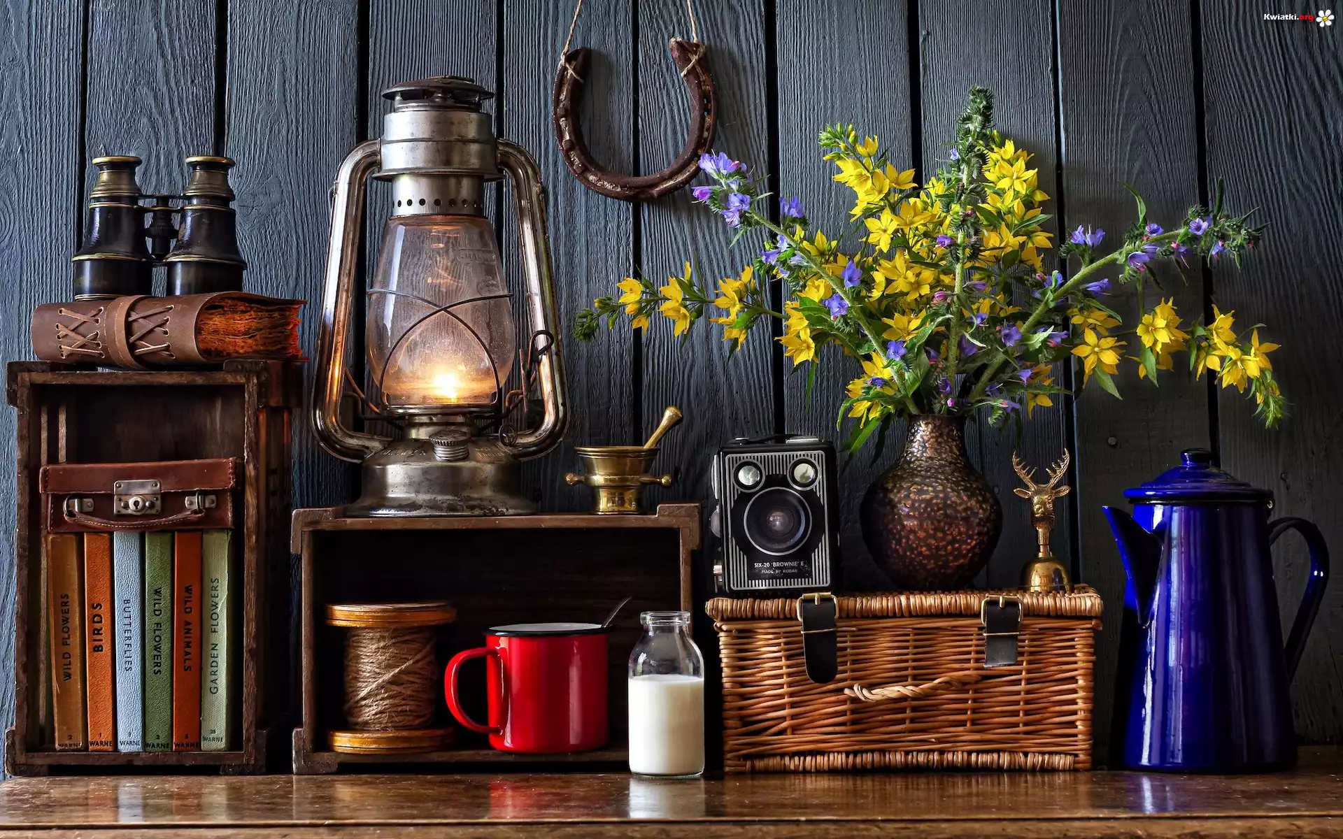 Kompozycja, Bukiet kwiatów, Lampa, Książki, Podkowa, Deski, Kubek, Dzbanek - Zdjęcia