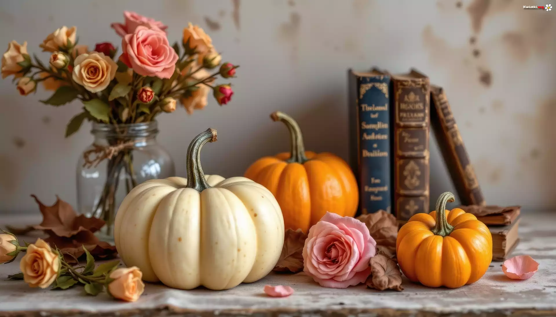 Dynie, Róże, Książki, Kompozycja - Zdjęcia