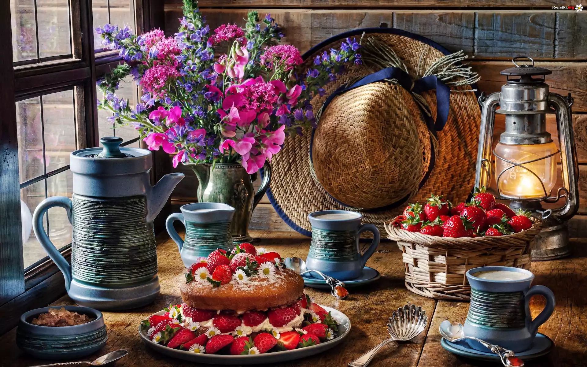 Kompozycja, Okno, Bukiet kwiatów, Kapelusz, Lampa, Ciasto, Truskawki, Dzbanek, Kubki - Zdjęcia