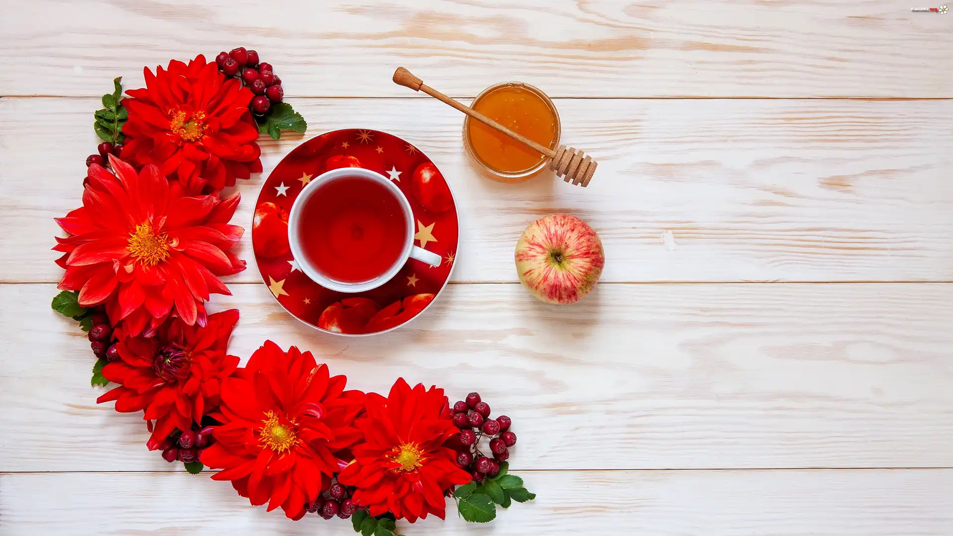 Czerwone, Kwiaty, Filiżanka, Herbaty, Jabłko, Słoik, Miód, Deski Kompozycja - Zdjęcia