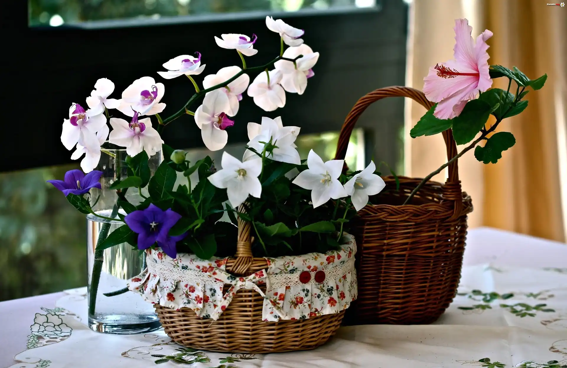 Kompozycja, Kosze, Kwiaty, Dzwonki, Hibiskus, Orchidea - Zdjęcia