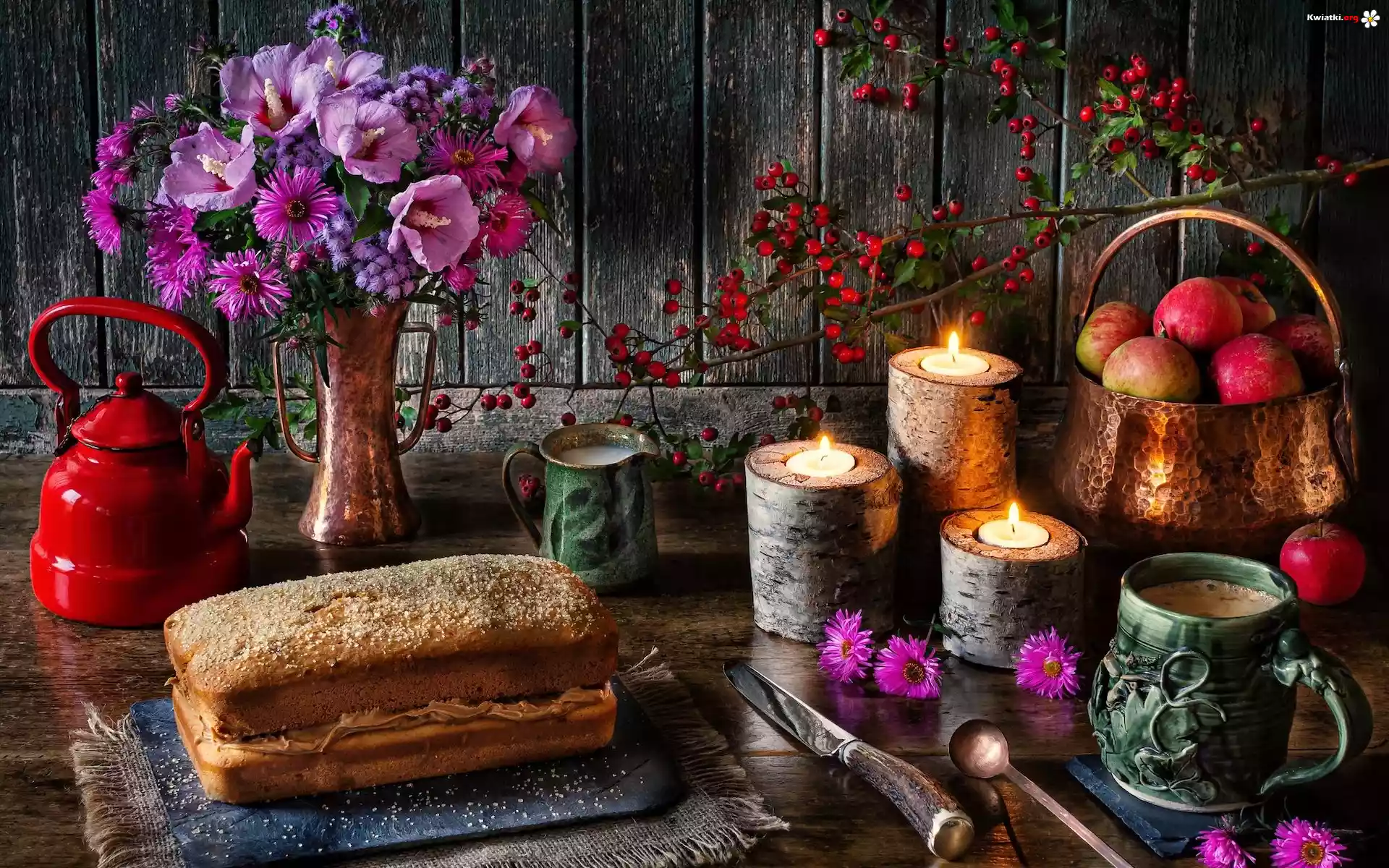 Kompozycja, Bukiet kwiatów, Jarzębina, Czajnik, Babka, Świece, Jabłka, Kubki, Nóż - Zdjęcia